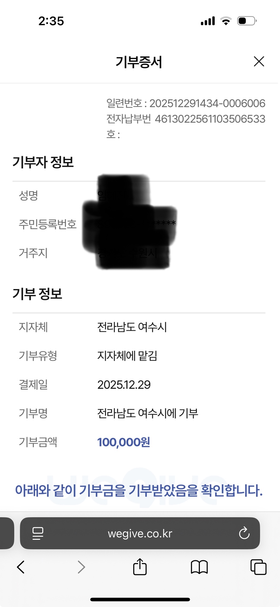 플랫폼은 위기브를 이용해 전라남도 여수시에 기부를 해봤어요.