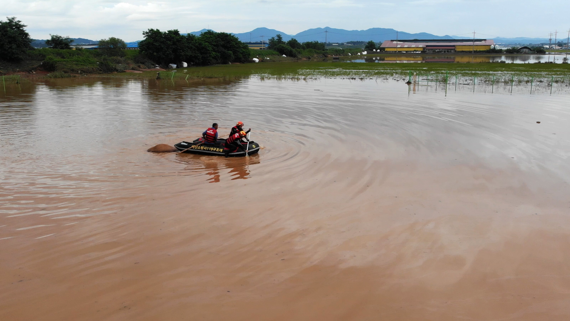 ▲ 소를 구출하기 위해 보트를 타고 움직이는 구조대 (© 충남 예산군)