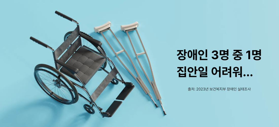 2023년 보건복지부 장애인 실태조사에 따르면 장애인의 약 35%가 일상생활에서 누군가의 도움 없이는 이런 기본적인 집안일조차 해내기 어렵다고 답했습니다.