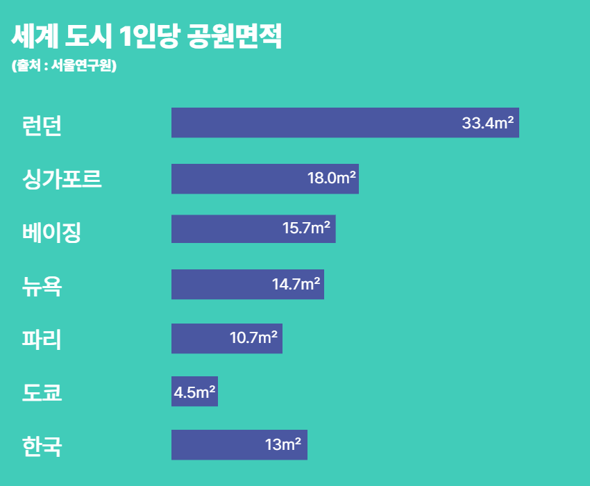 우리나라의 1 인당 도시공원 면적은 약 13㎡(2024년 기준)로 꾸준히 증가하고 있지만, OECD 주요국 평균인 20㎡과 비교하면 여전히 부족합니다.