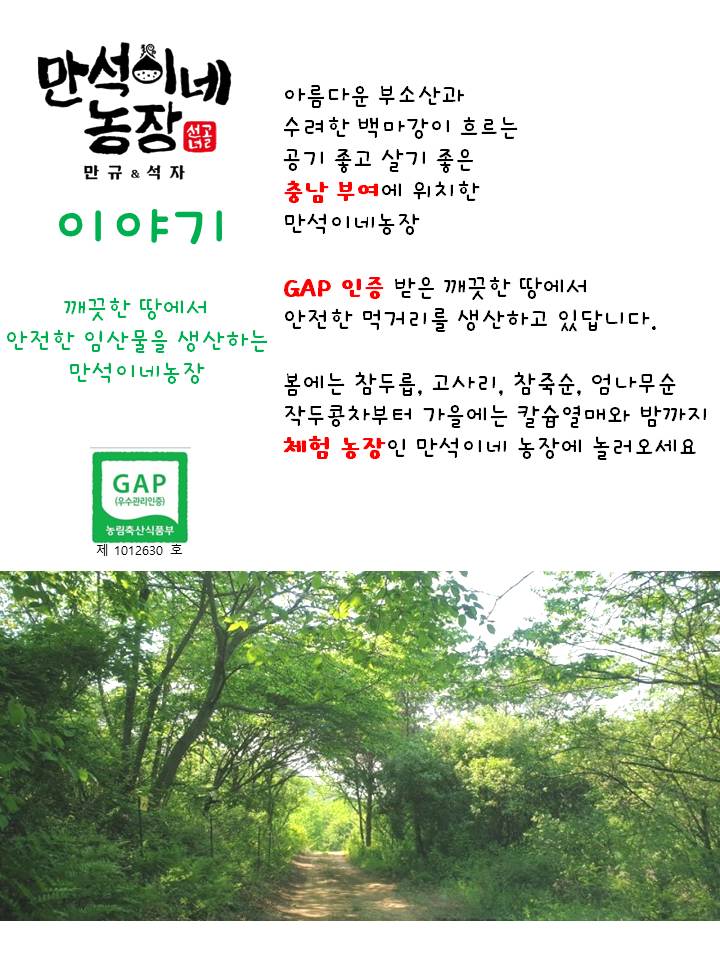 | 생산자 및 소재지(수입품의 경우 생산자, 수입자 및 제조국) | 만석이네농장 농업회사법인(주)/ 충남 부여 |