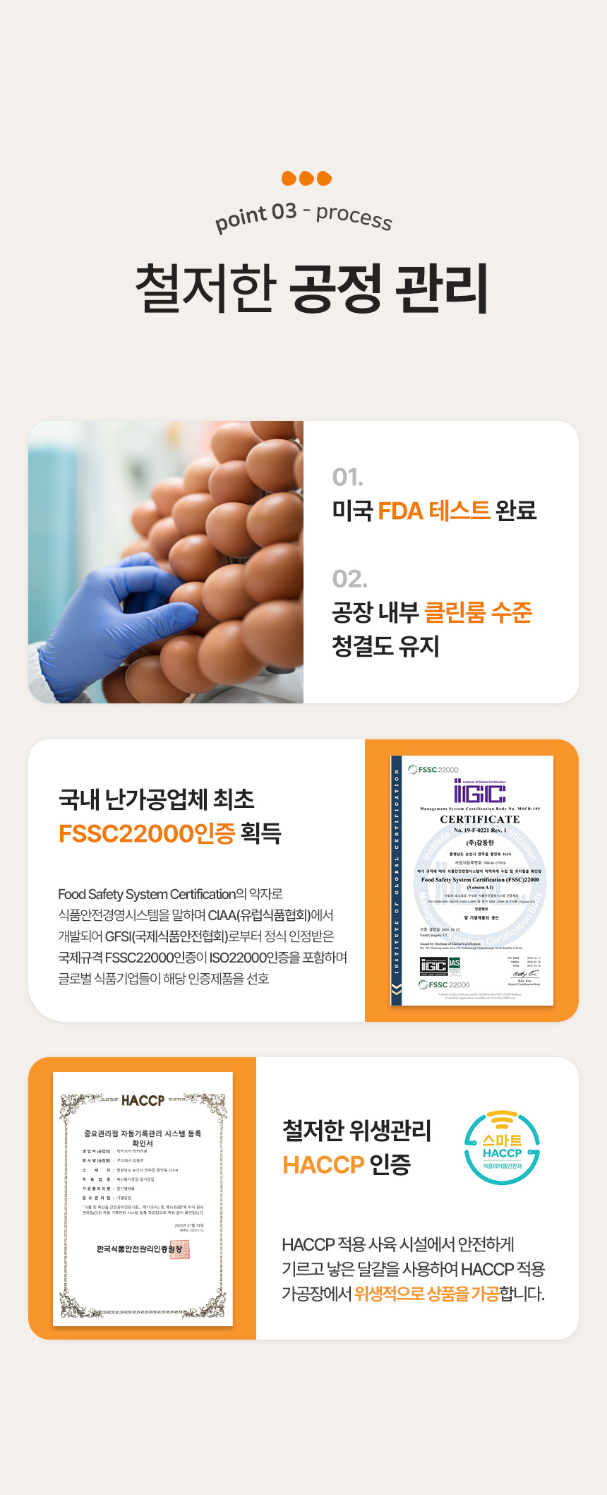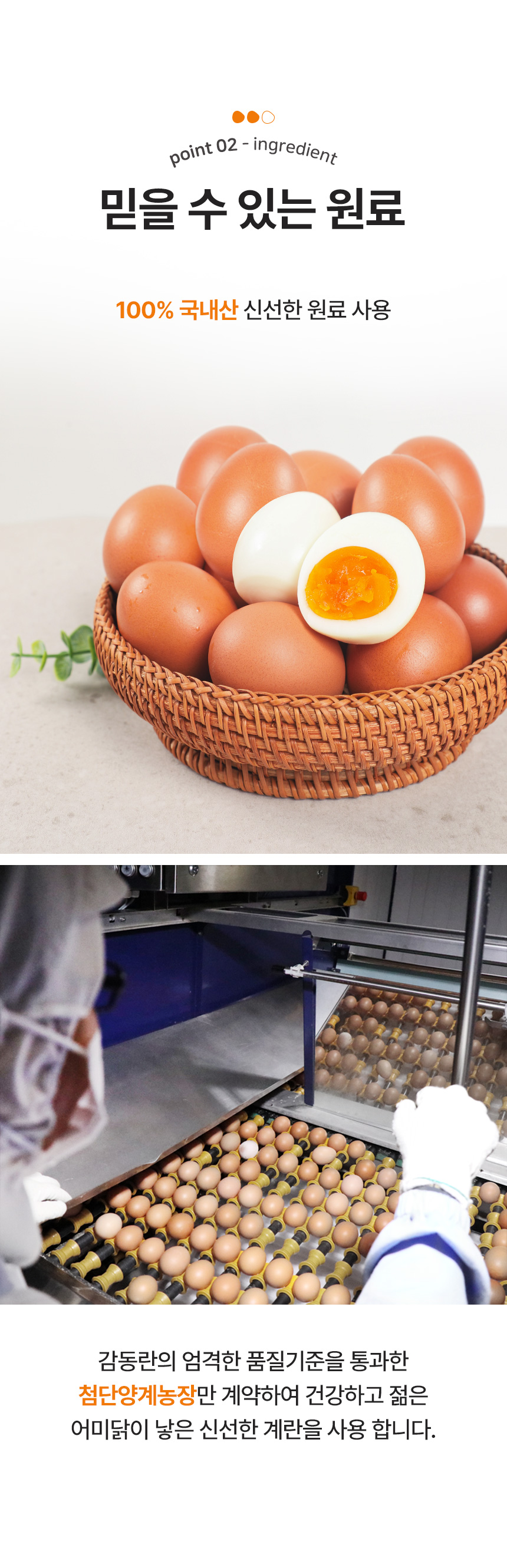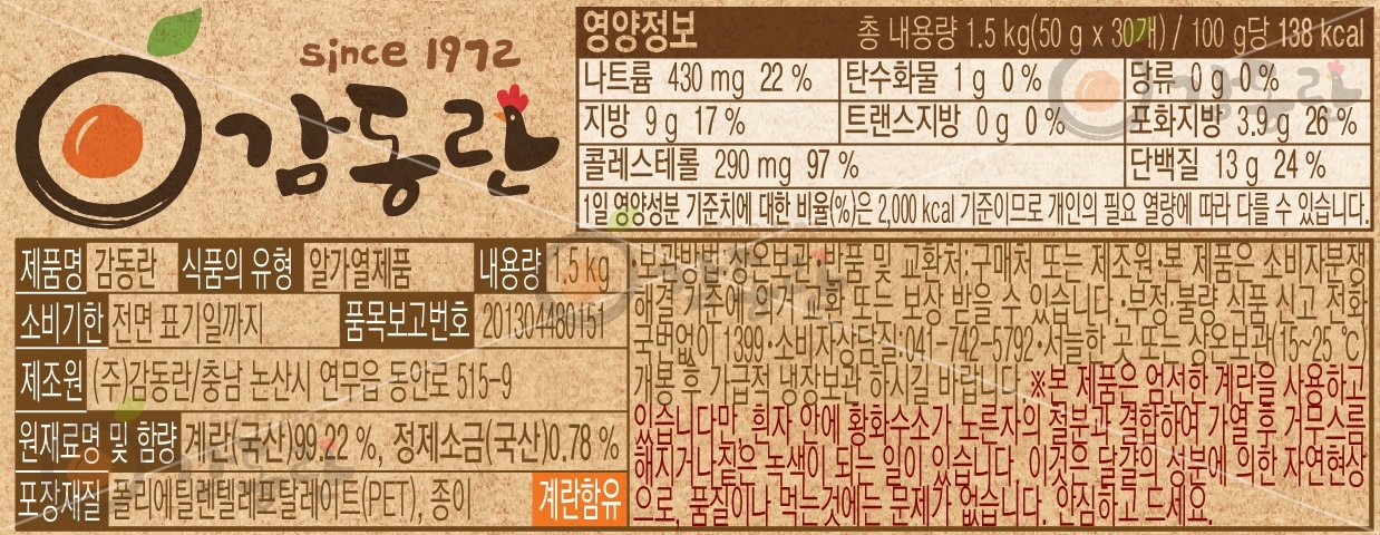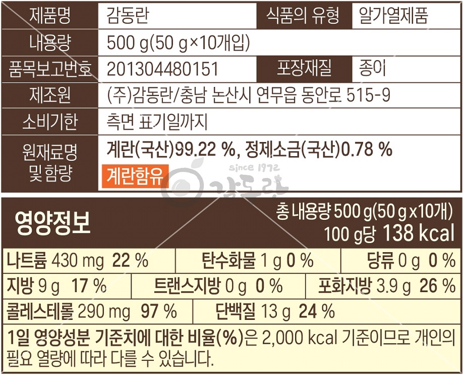 | 원재료명 (「농수산물의 원산지 표시 등에 관한 법률」에 따른 원산지 표시 포함) 및 함량(원재료 함량 표시대상 식품에 한함) | 계란(국산) 99.22%, 정제소금(국산) 0.78% |