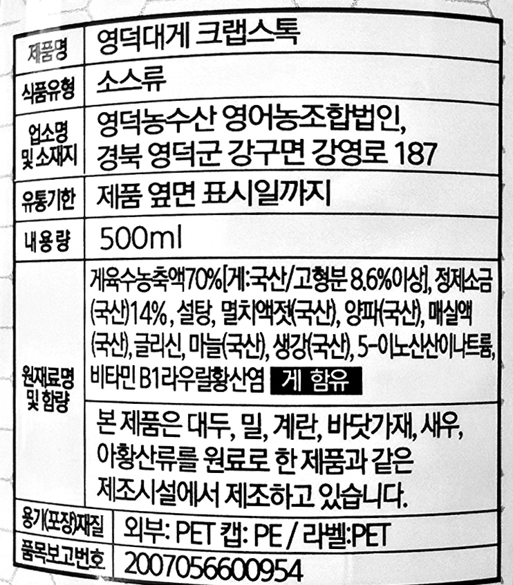 | 포장단위별 내용물의 용량(중량), 수량, 크기 | 영덕게 크랩스톡1000ml*1병 |