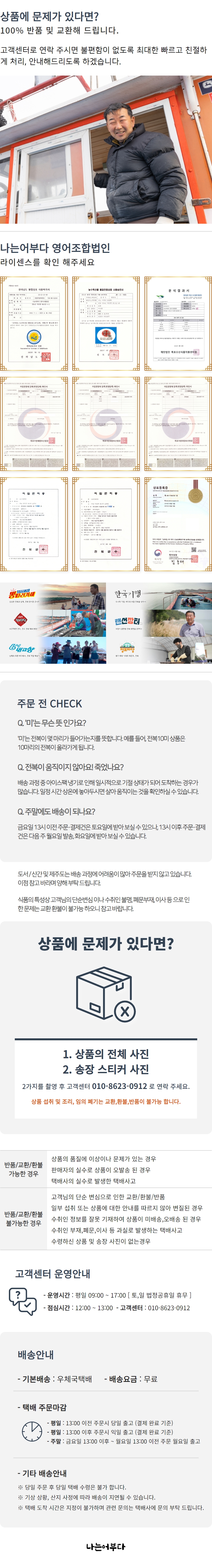 | 보관방법 또는 취급방법 | 수령 후 바로 드시거나, 그렇지 않을 경우 손질 후 냉동보관 하셔야 합니다. |