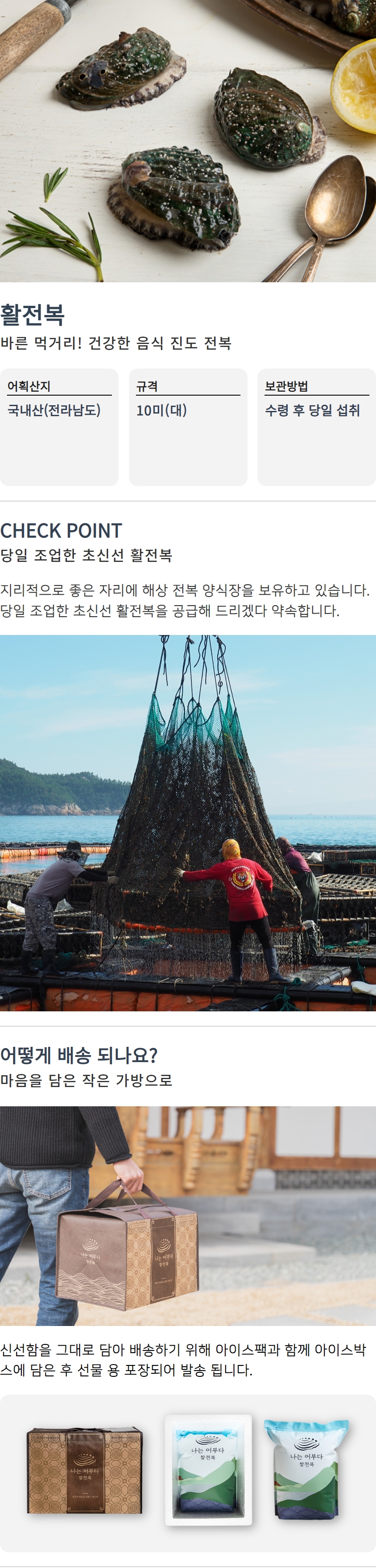| 상품구성 | 전복, 산소포장팩, 아이스팩, 손질도구, 아이스박스, 선물가방 |