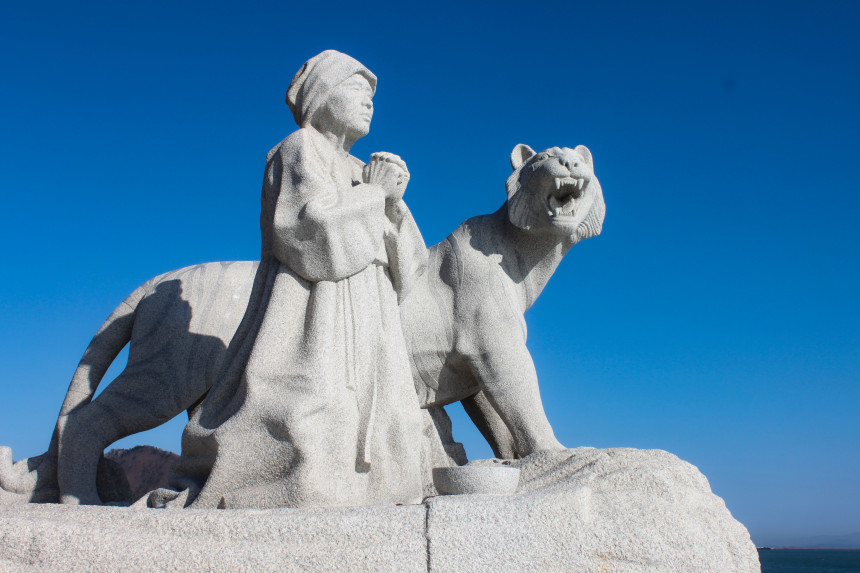 (신비의 바닷길 앞에 세워진 뽕할머니 동상)