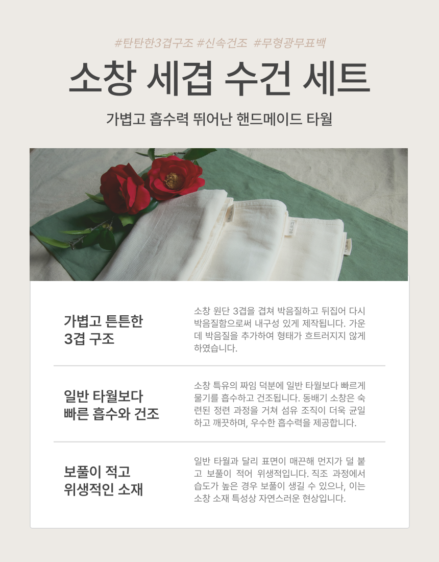 강화 소창 3겹 수건 3개 세트(44*84cm 3매)