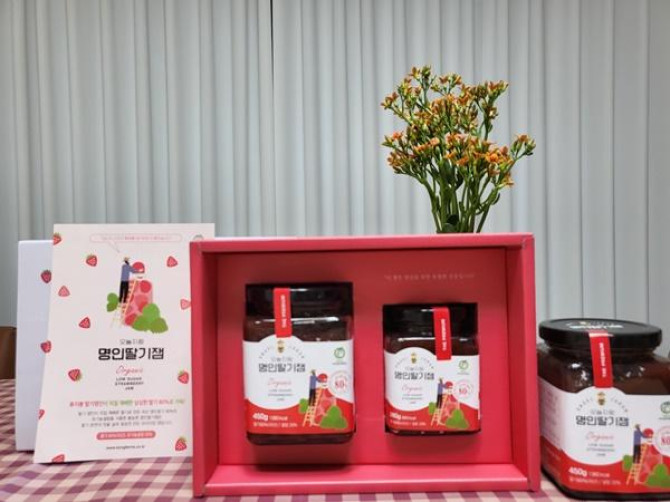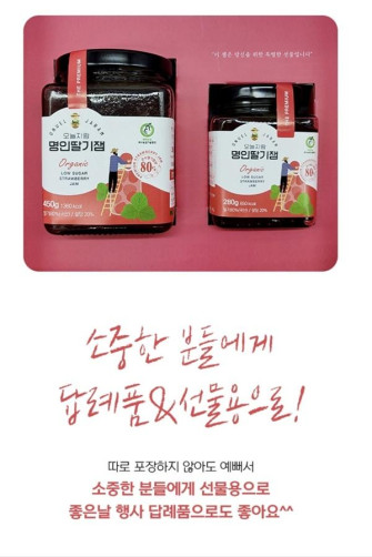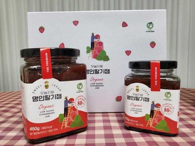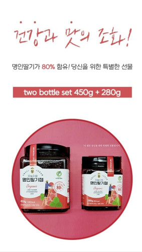 | 원재료명 (「농수산물의 원산지 표시 등에 관한 법률」에 따른 원산지 표시 포함) 및 함량(원재료 함량 표시대상 식품에 한함) | 딸기80%, 유기농설탕 20% |