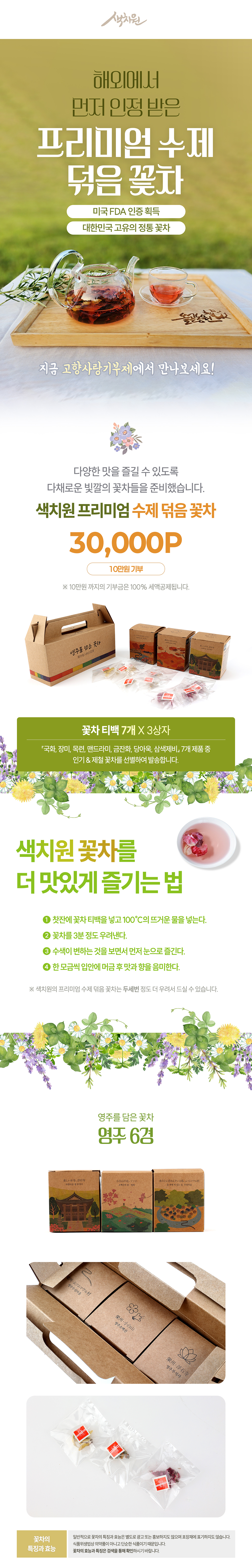 | 포장단위별 내용물의 용량(중량), 수량 | 영주를 담은 꽃차 포장상자 1개(영주 풍경 소형 상자 3개에 각각 티백 7개) |