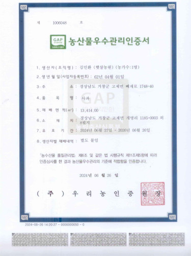 | 원산지 | 경남 거창군 고제면 빼재로 1748-40 햇살농원 김민환 고현숙 |