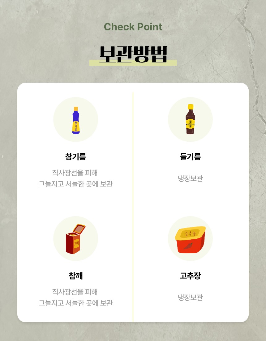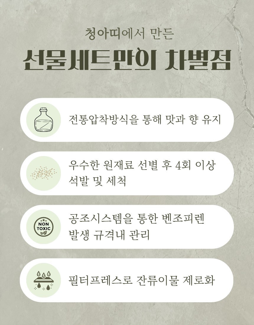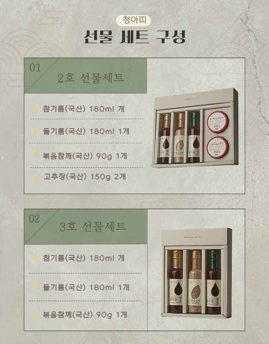 | 포장단위별 내용물의 용량(중량), 수량 | 참기름 180ml, 들기름 180ml, 볶음참깨 90g, 각 1개 |