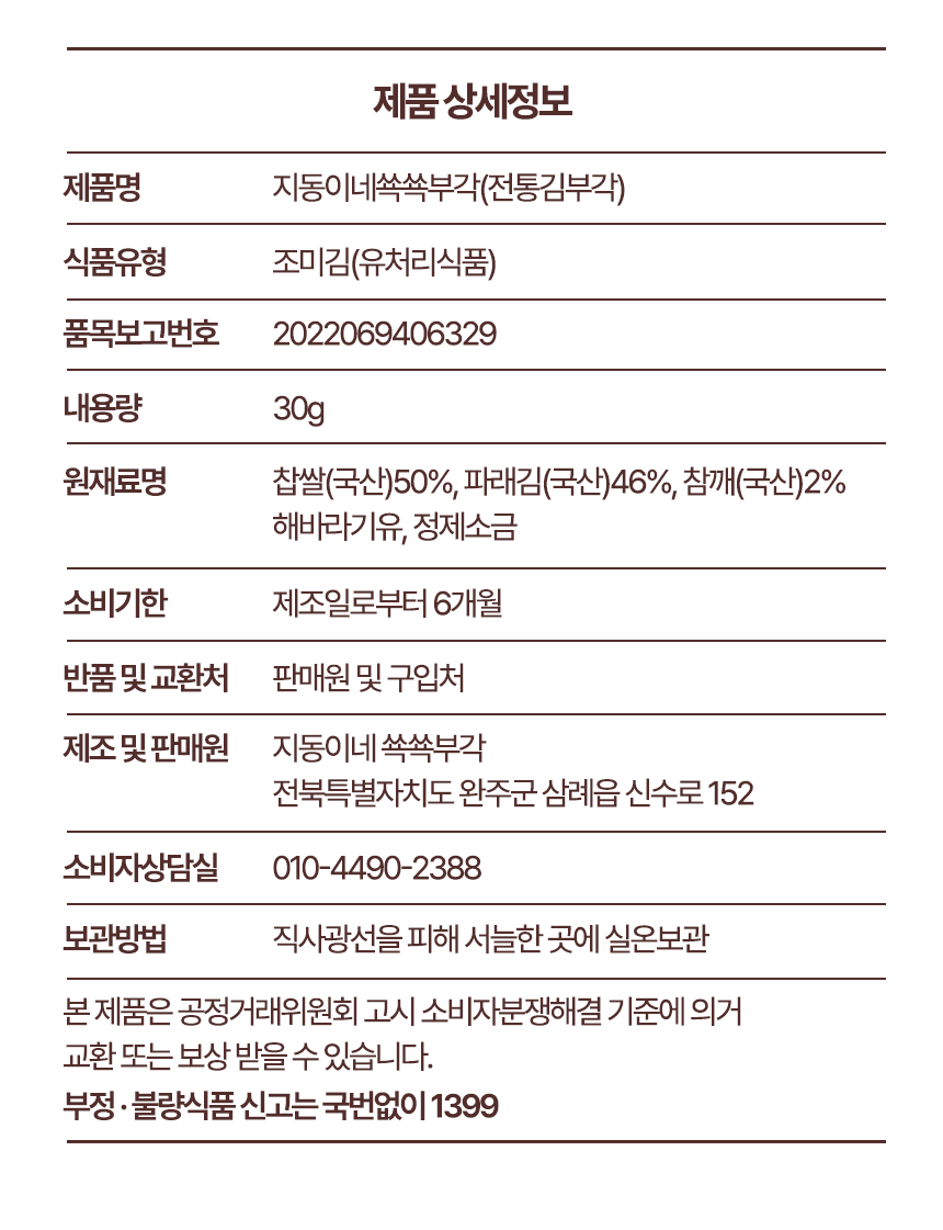 생산자 및 소재지(수입품의 경우 생산자, 수입자 및 제조국) 지동이네 쑉쑉부각 전북특별자치도 완주군 삼례읍 신수로152