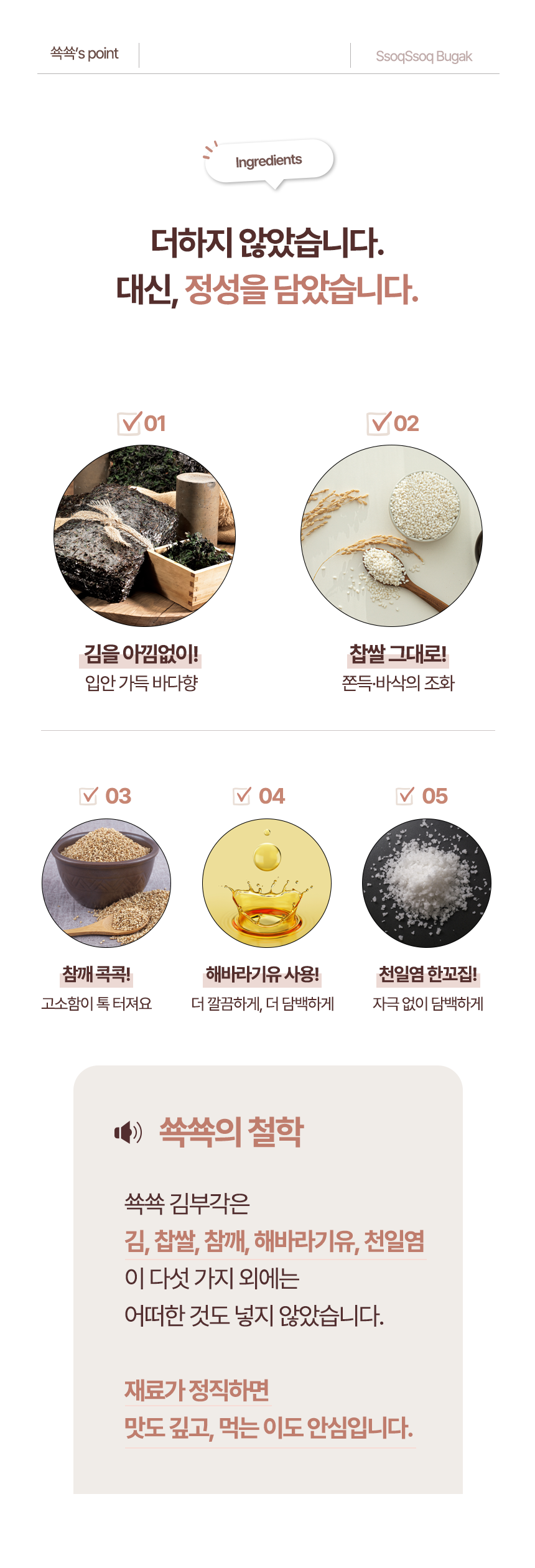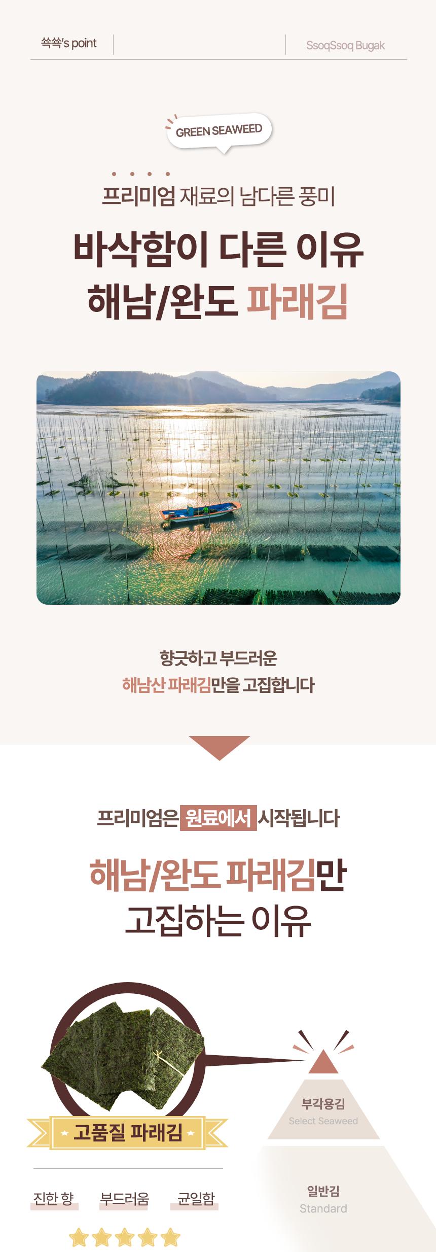 원재료명 (「농수산물의 원산지 표시 등에 관한 법률」에 따른 원산지 표시 포함) 및 함량(원재료 함량 표시대상 식품에 한함) 찹쌀(국산)50%, 파래김(국산)46%, 참깨(국산)2%, 해바라기유, 정제소금