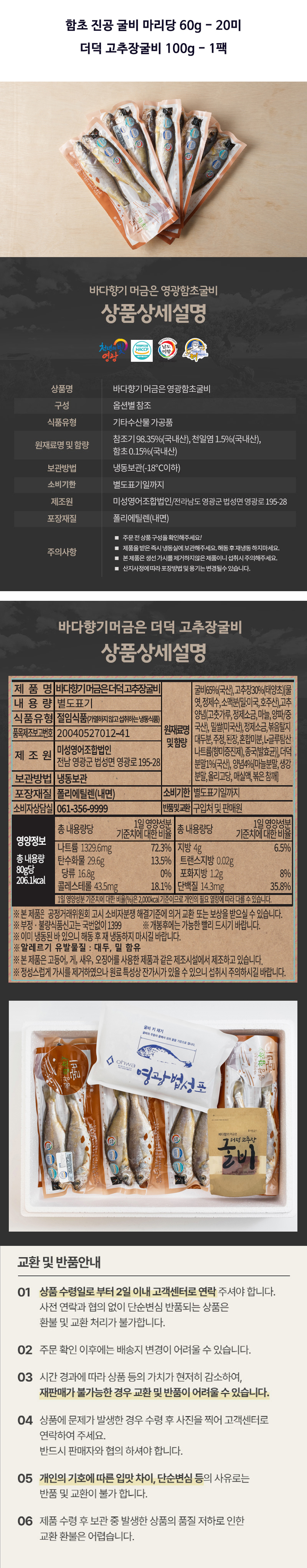 | 제조연월일, 소비기한 또는 품질유지기한 | 함초굴비 : 제조일로부터 2년, 더덕고추장굴비 : 제조일로부터 18개월 |