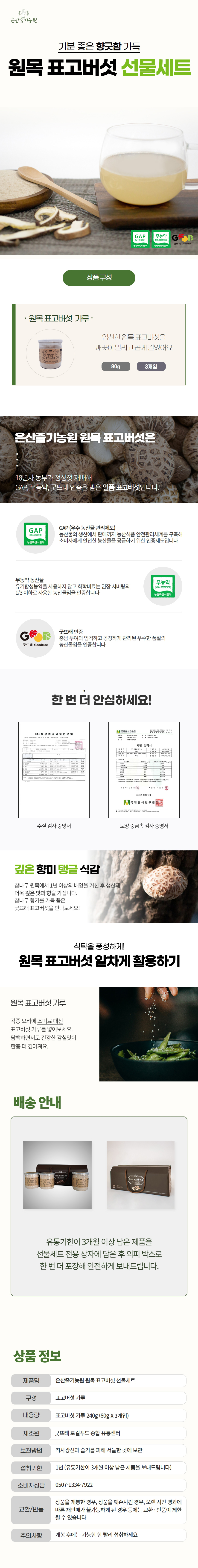 | 포장단위별 내용물의 용량(중량), 수량 | 240g (표고버섯가루 80g*3) |