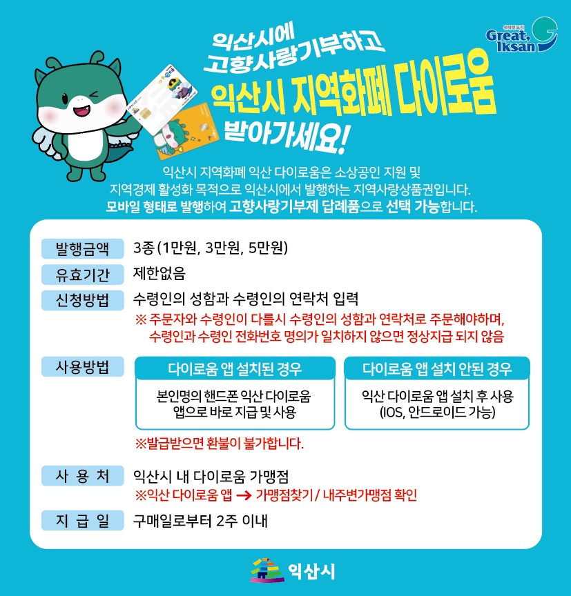 | 이용 가능 매장 | 익산시 내 다이로움 가맹점 ※다이로움 앱 → 가맹점 찾기 / 내주변가맹점 확인 |