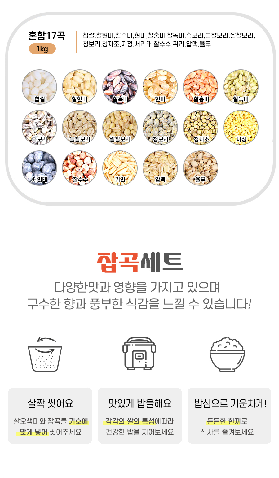 | 상품구성 | 혼합17곡 1kg , 찰오색미 1kg, 삼색보리 1kg |
