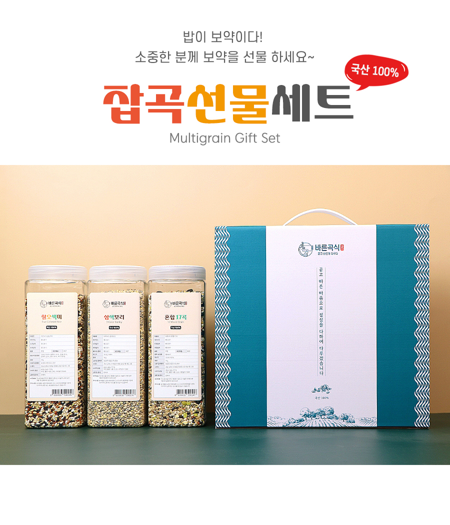 바른곡식 잡곡 선물세트 3kg(찰오색미, 혼합 17곡, 삼색보리 각 1kg)