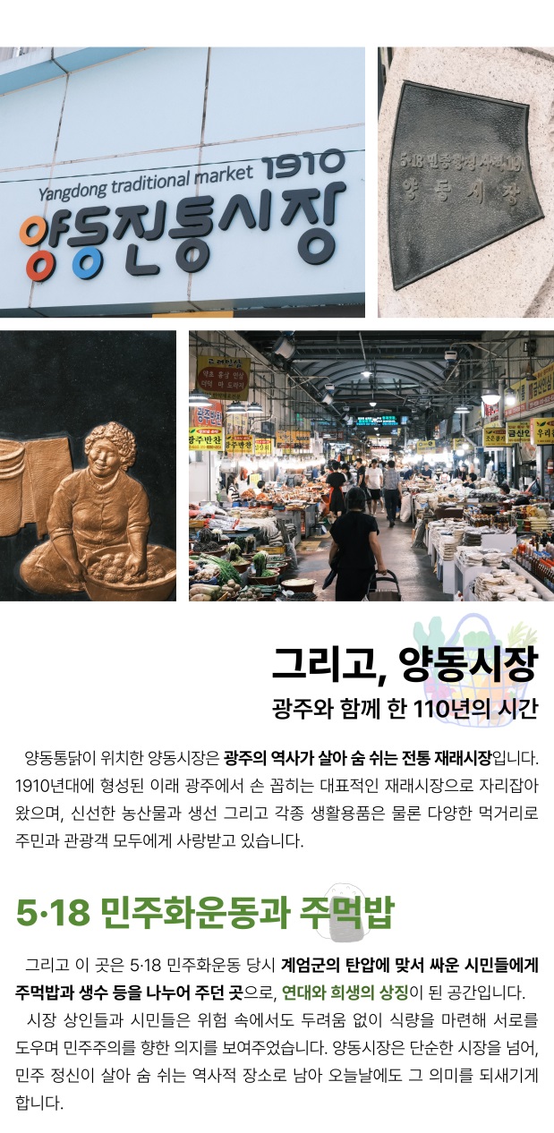 광주광역시의 중심에 우뚝 선 광주 서구. 광주광역시청과 광주 교통의 요충지 종합버스터미널, 그리고 월드컵 4강 신화를 쓴 광주월드컵경기장까지 전부 광주 서구에 위치해 있습니다. 또한 광주 서구에서는 아름다운 자연풍경과 문화유산을 골고루 살펴볼 수 있는 서구 8경이 있어 관광객들에게 보다 알찬 추억을 선사합니다. 마지막으로 100년 전통의 양동시장은 꼭 방문해보시길 바랍니다. 호남지역의 최대 재래시장인 양동시장은 다채로운 먹거리로 여러분의 입을 더욱 즐겁게 만들어드릴 거랍니다.
