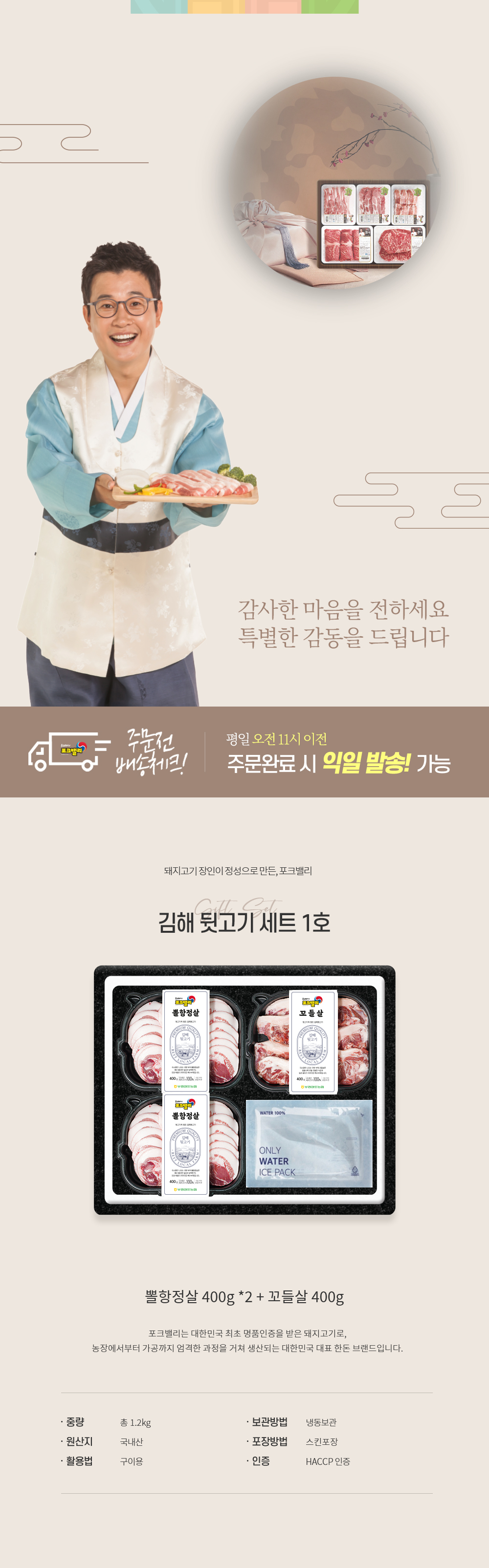| 포장단위별 내용물의 용량(중량), 수량, 크기 | 뽈항정살 (400g*2) + 꼬들살 400g |