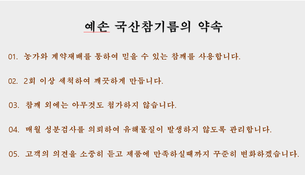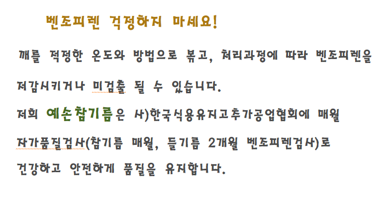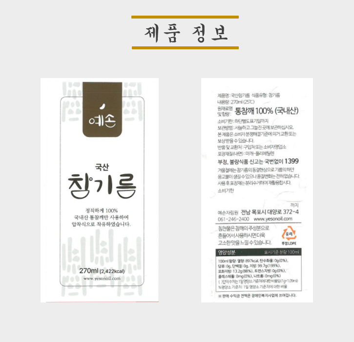 | 원재료명 및 함량 | 국내산 참깨 100% (원산지: 대한민국) |
