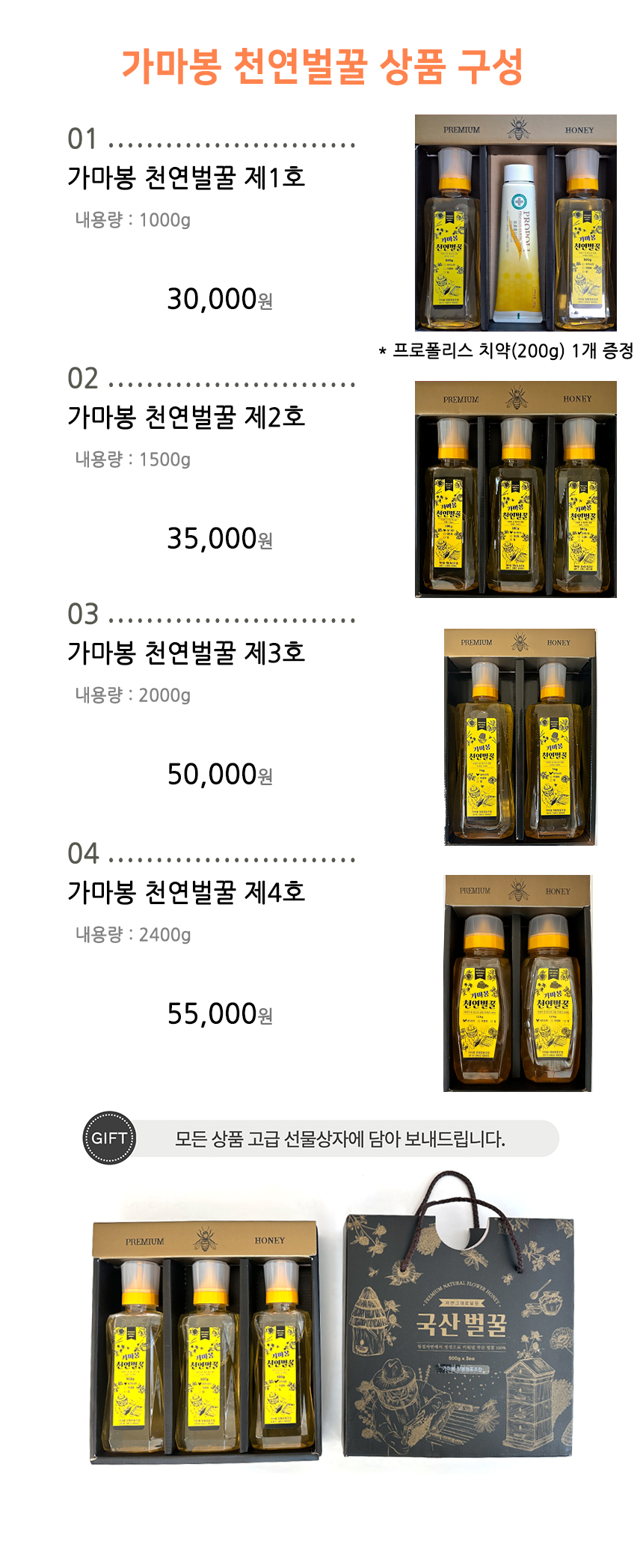 | 상품구성 | 가마봉 천연벌꿀 제1호(아까시아꿀 500g*2병+프로폴리스 치약) |