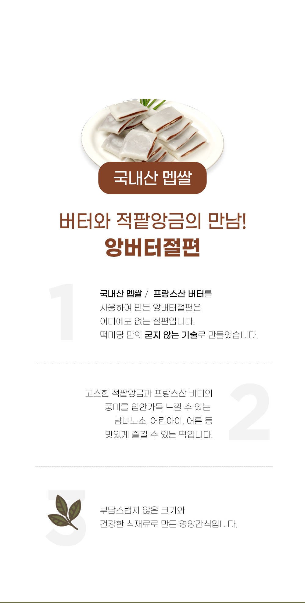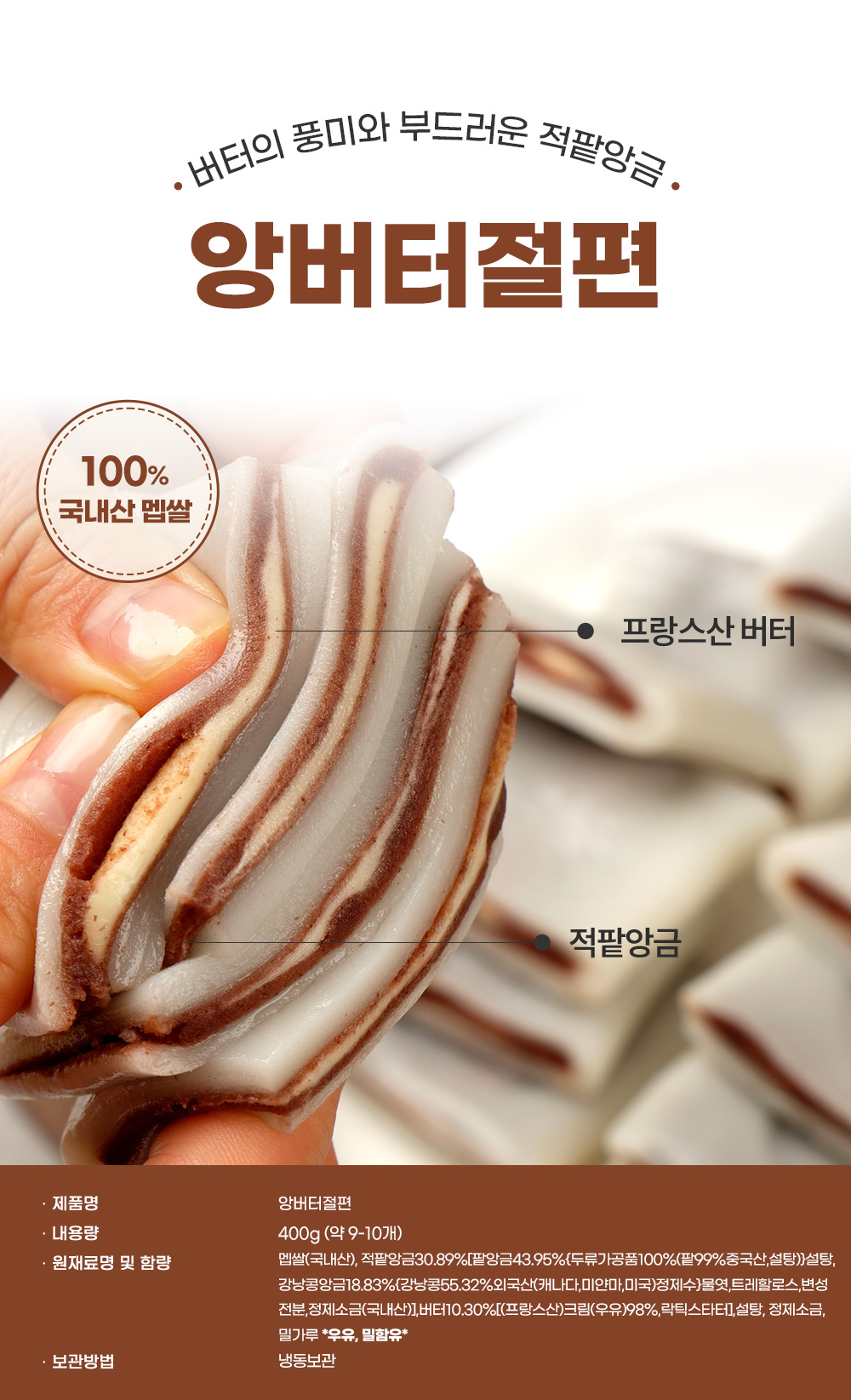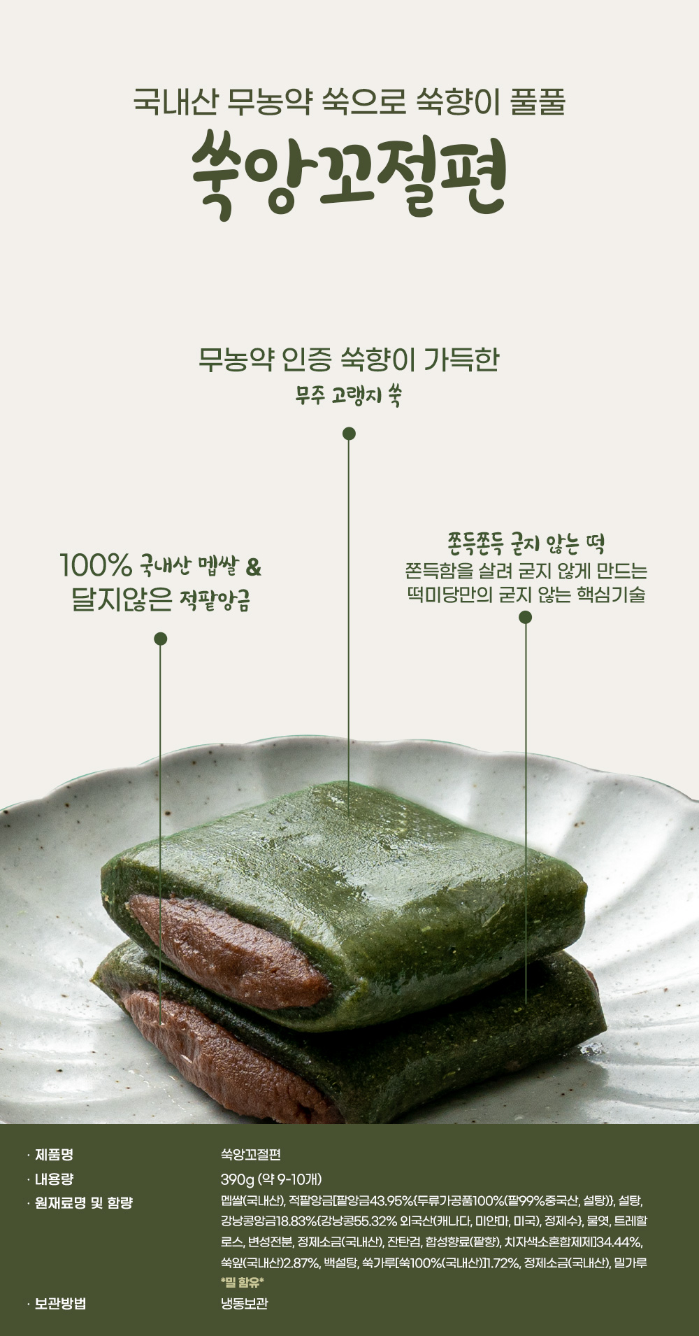 | 포장단위별 내용물의 용량(중량), 수량 | 밥알쑥인절미600g, 쑥앙꼬절편 390g, 앙버터절편400g |
