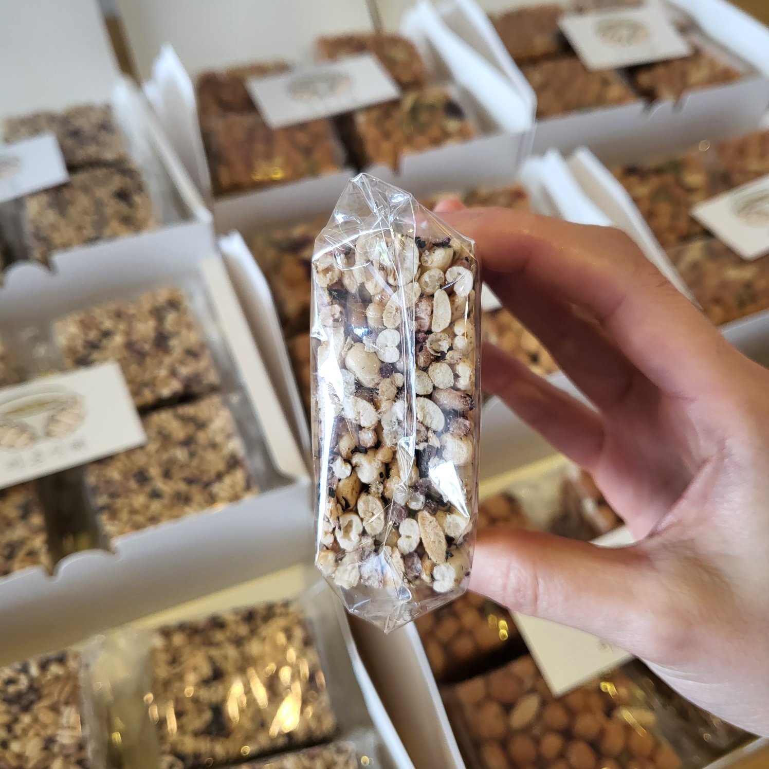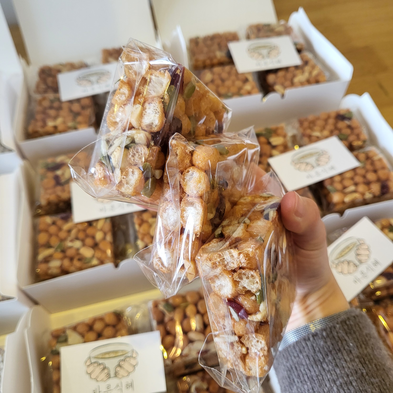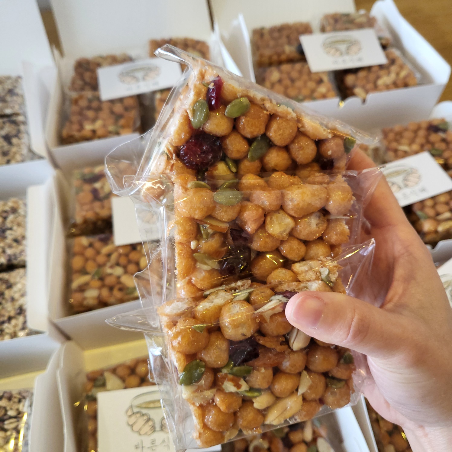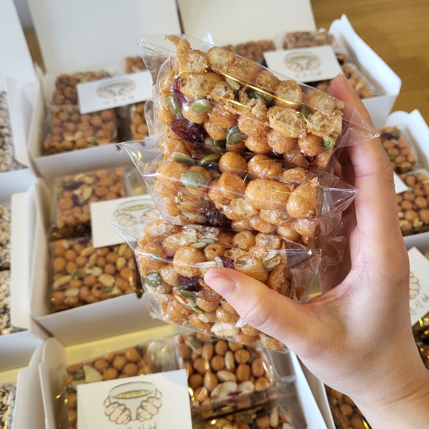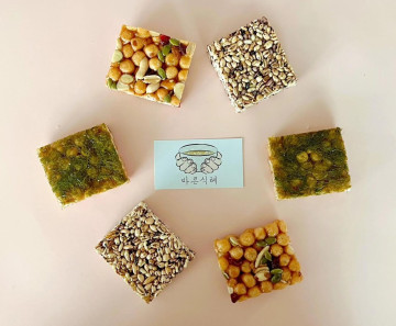 바삭하면서도 쫀득한 식감을 잘 살리려 물엿과 조청을 알맞게 배합하고, 각종 견과를 첨가해 고소한 풍미를 극대화 하였습니다.