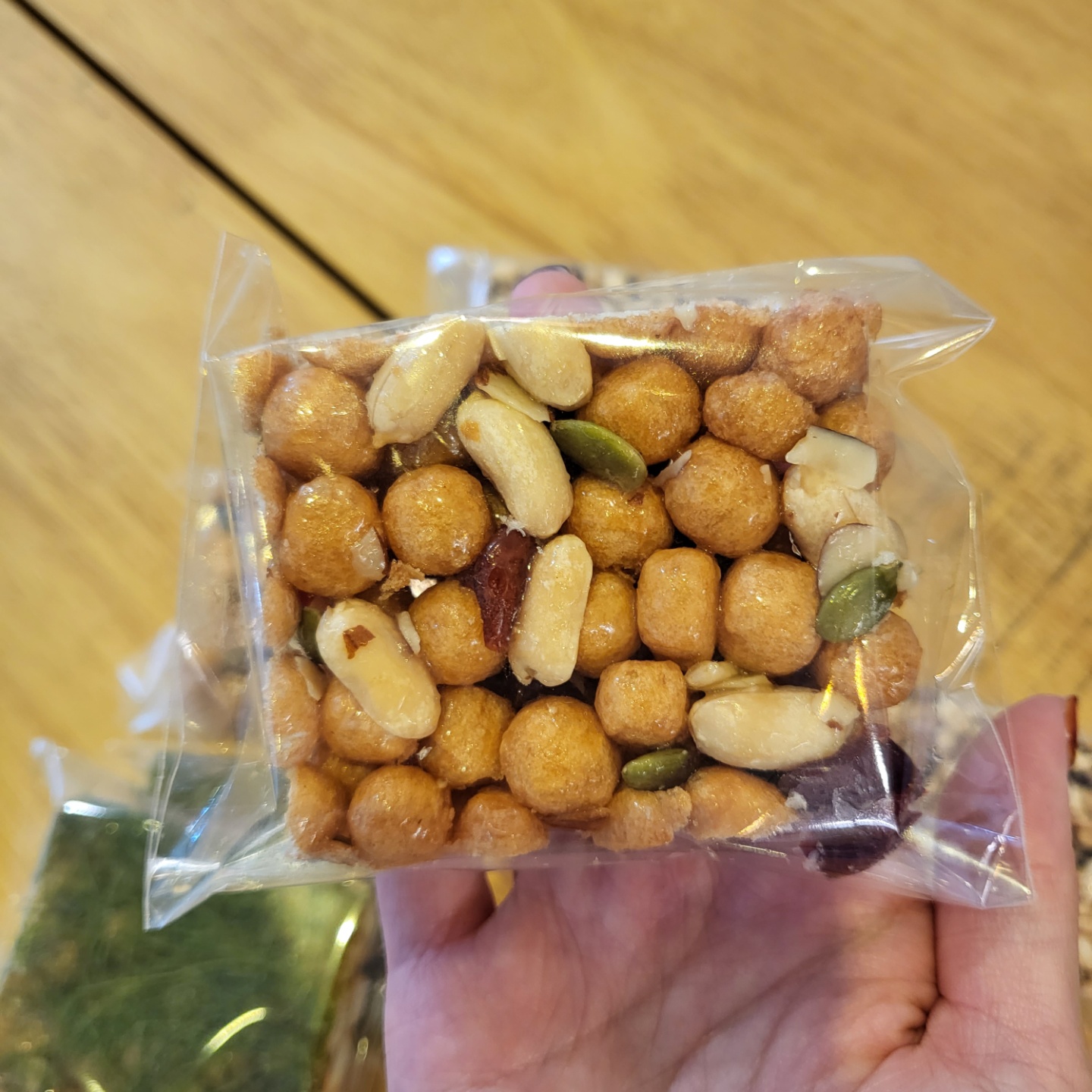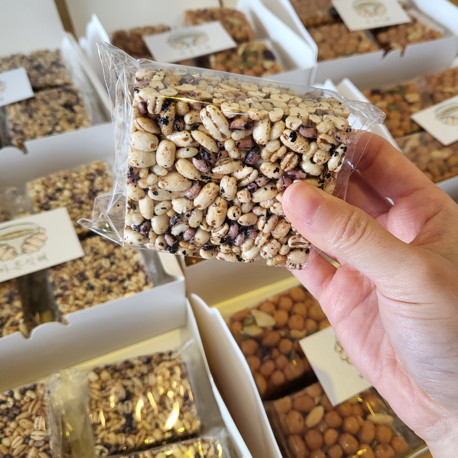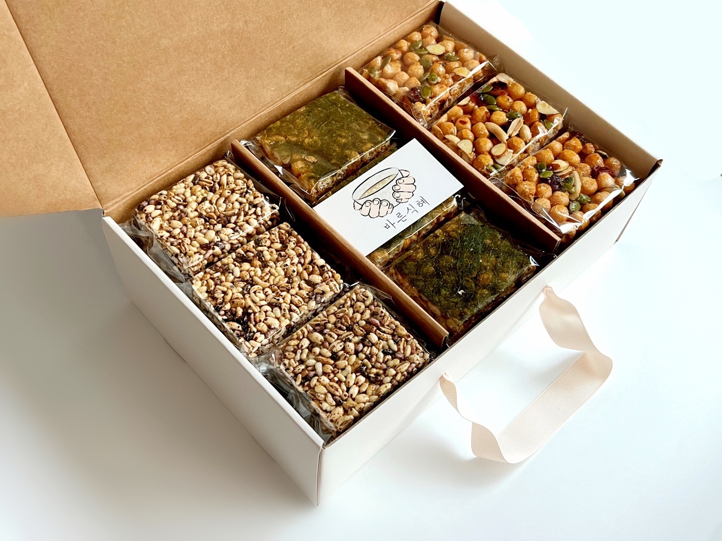 | 원재료명 및 함량 | 소맥분(캐나다산, 미국산, 호주산) 80%, 조청(국내산)7%, 견과류믹스 (중국산) 5.5%, 식용유,버터(국내산) 0.5%, 정제당, 현미퍼핑,흑미퍼핑, 보리튀밥, 감태(국산) |