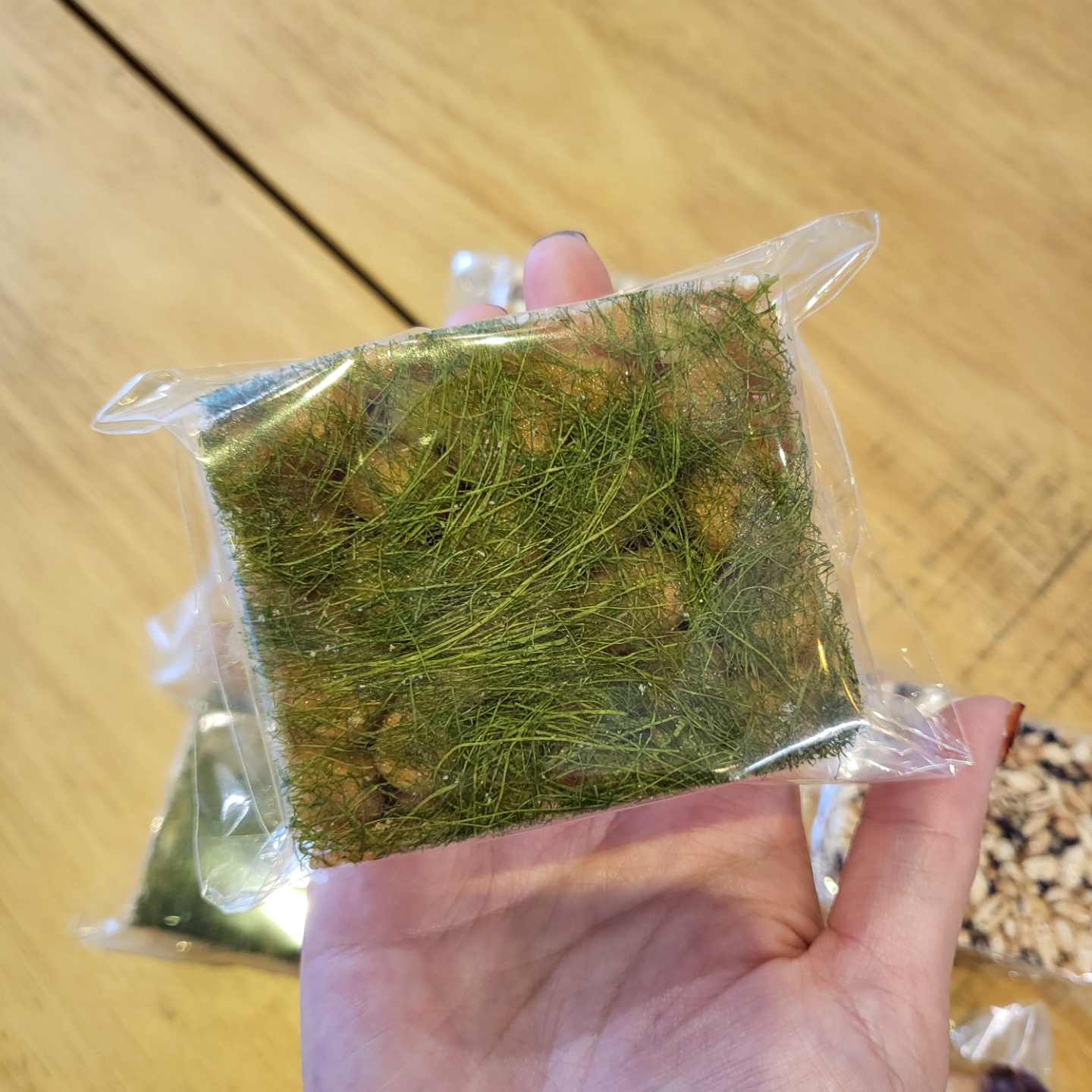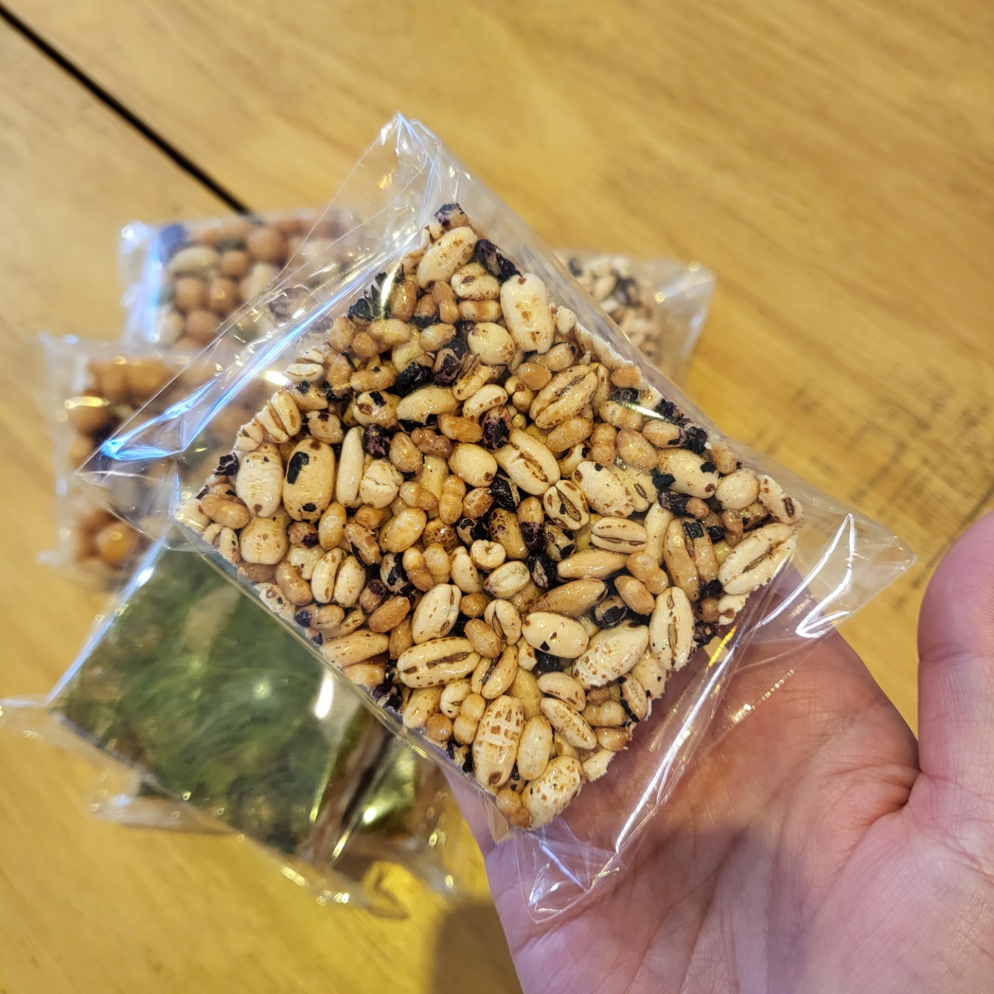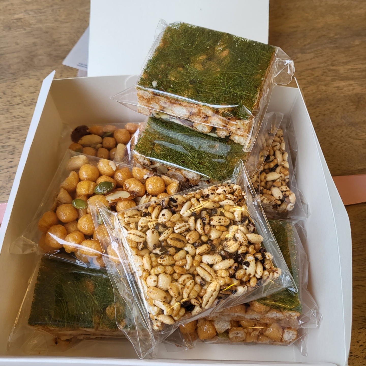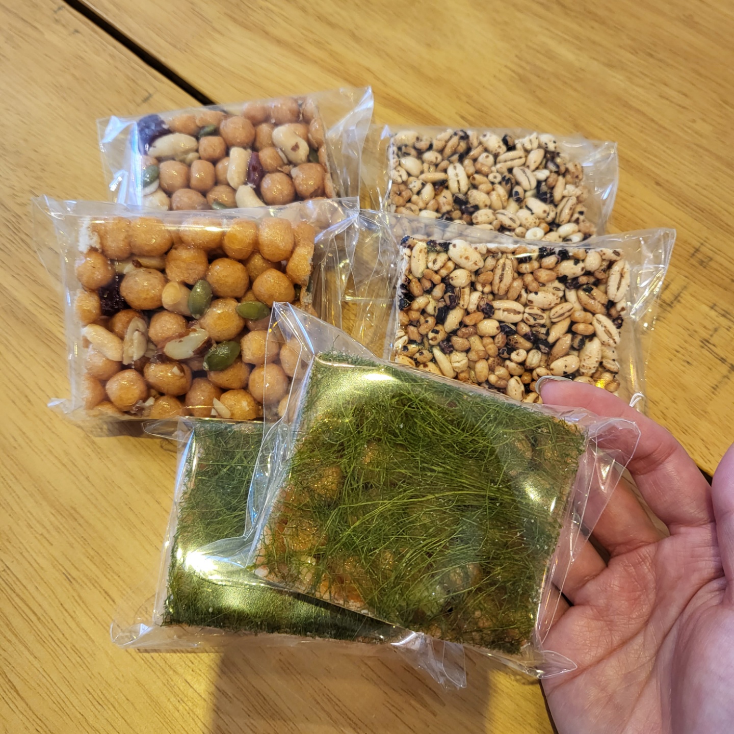 | 원재료명 및 함량 | 소맥분(캐나다산, 미국산, 호주산) 80%, 조청(국내산)7%, 견과류믹스 (중국산) 5.5%, 식용유,버터(국내산) 0.5%, 정제당, 현미퍼핑,흑미퍼핑, 보리튀밥, 감태(국산) |