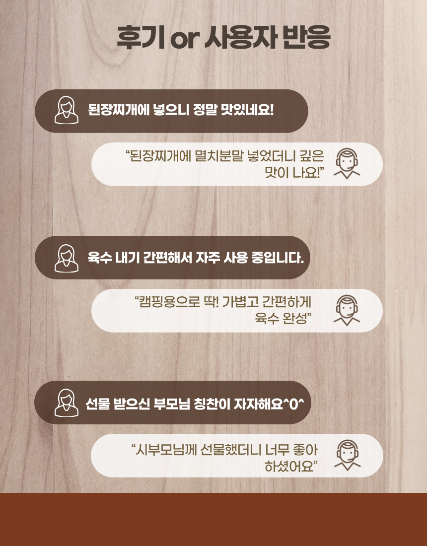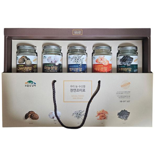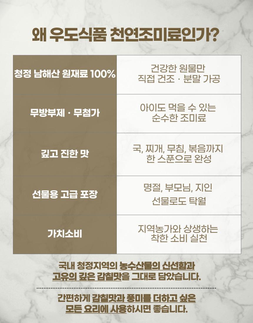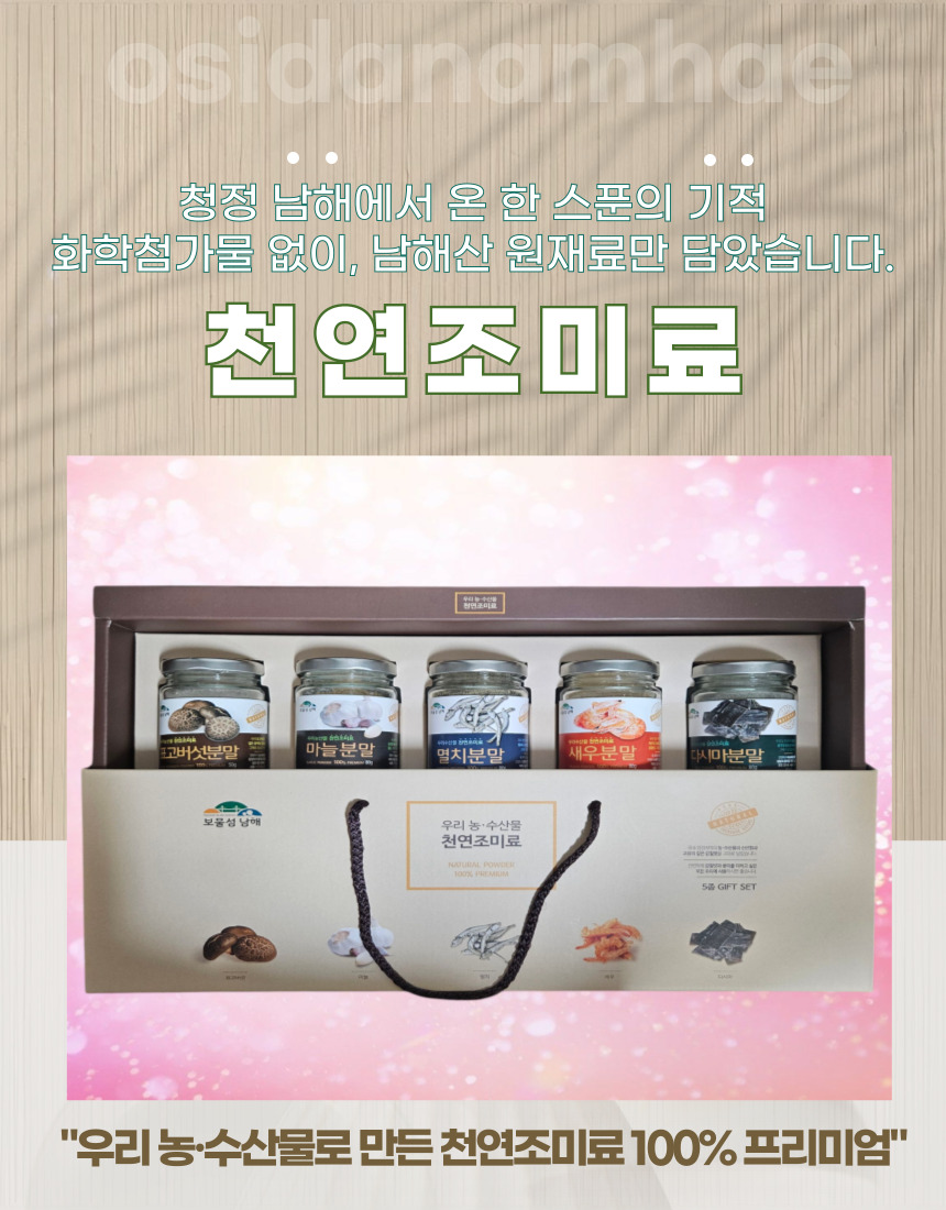《우도식품 천연조미료 5종 세트》? 남해 자연을 담은 한 스푼의 기적청정 남해산 재료만 100% 사용한우도식품 천연조미료 5종 세트? 국내산 100% 원물만을 갈아 넣었습니다!✔ 표고버섯분말 – 깊은 감칠맛✔ 마늘분말 – 풍미와 건강을 동시에✔ 멸치분말 – 진한 육수 베이스✔ 새우분말 – 감칠맛 폭발, 찌개 필수템✔ 다시마분말 – 자연의 깊은 바다맛모든 제품, 첨가물 0%, 방부제 0%, 오직 자연 그대로.? 이럴 때 꼭 필요합니다!✅ 국ㆍ찌개ㆍ조림에 깊은 맛을 더하고 싶을 때✅ 육수 내기 귀찮을 때✅ 아이 식단에도 안심하고 넣을 수 있는 조미료가 필요할 때✅ 캠핑, 자취, 간편 요리에 진심일 때✅ 부모님, 지인에게 건강한 선물을 하고 싶을 때? 고급 선물 포장으로 마음까지 전하세요깔끔한 유리병 패키지프리미엄 선물박스 구성명절, 집들이, 감사선물, 부모님 선물로 추천!? 이렇게 사용해보세요!된장찌개에 멸치 + 다시마불고기 양념에 마늘분말해물칼국수 육수에 새우분말채소볶음이나 무침에 표고버섯분말샐러드 드레싱에 살짝 마늘 + 다시마“된장찌개에 멸치분말 한 스푼 넣었더니 깊은 맛이 확 살아나요!”“육수 내기 너무 편해요. 다시마랑 새우 분말은 캠핑 갈 때 필수템!”“부모님 드렸더니 너무 좋아하세요. 건강한 맛이라고요.”? 구성 안내? 왜 우도식품 천연조미료일까요?100% 국내산 : 남해산 농수산물만 선별하여 사용무첨가 & 무방부제 : 오직 자연 그대로의 건강한 분말다용도 활용 : 국, 찌개, 무침, 볶음, 육수까지 한 스푼으로 완성지역상생 : 남해 농어민과 함께 만드는 착한 소비선물용으로도 탁월 : 감성과 실용을 모두 담은 프리미엄 패키지청정 남해가 키운 자연 그대로의 맛을여러분의 식탁 위로 전해드립니다.? 우리 가족 밥상이 바뀝니다. 지금 바로 만나보세요! 오시다남해https://osidanamhae.co.kr