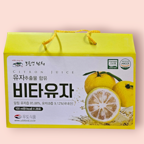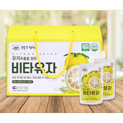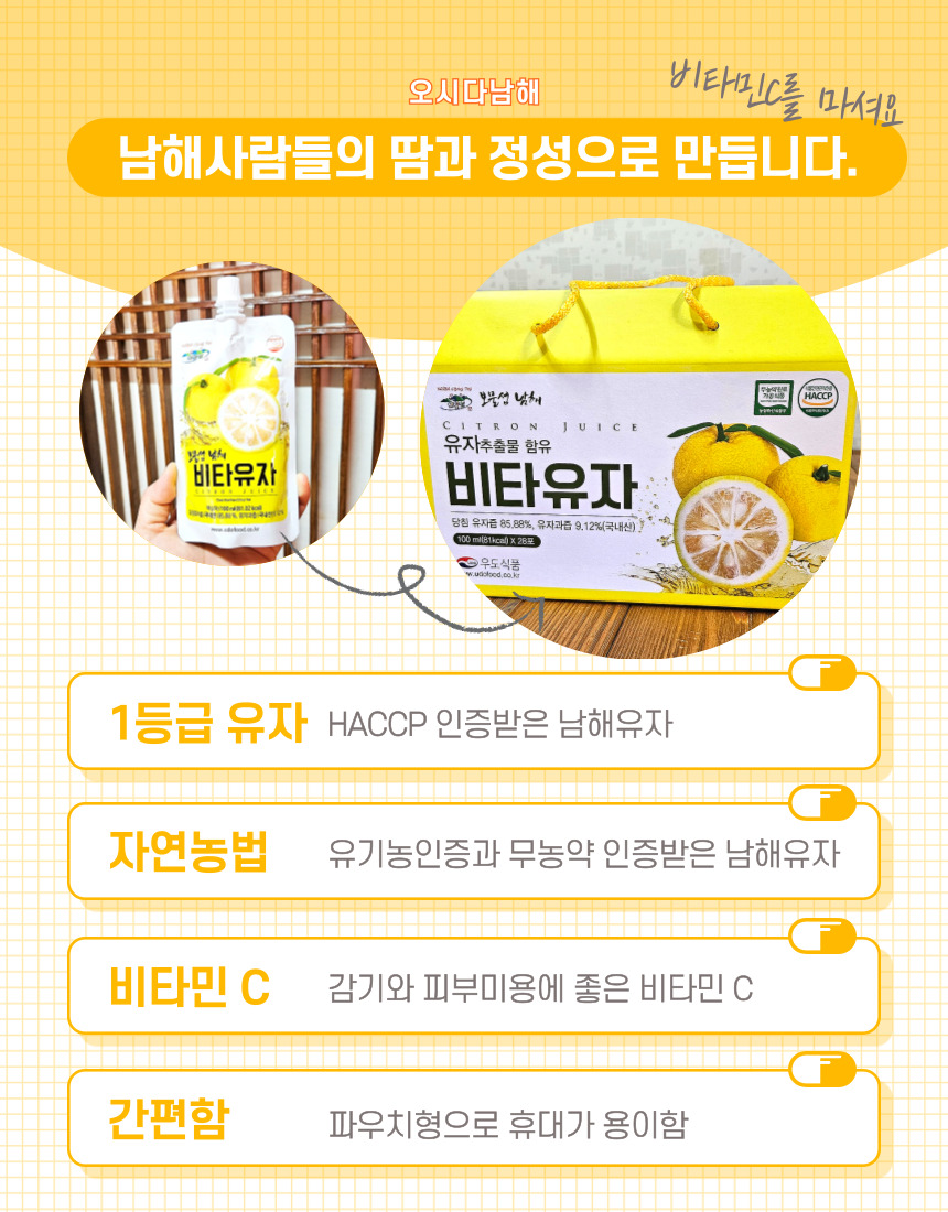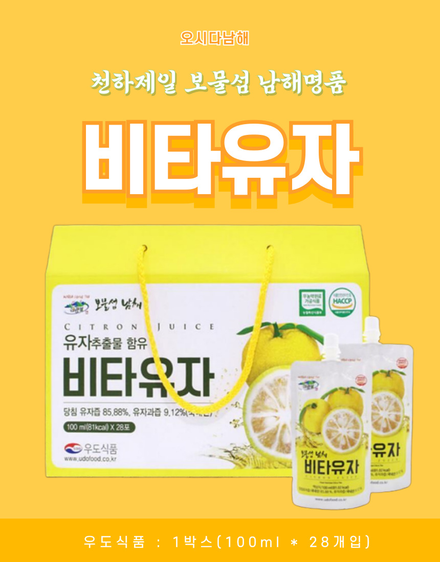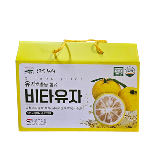 제품명: 비타유자Vita Citrus Juice유자 95%함유 유자음료액상차 100ml(81.02kcal)100ml*28ea/set당침유자즙(국내산)85.88%유자과즙(국내산)9.12%제조원: 케이팜(주)/우도식품 비타유자는청정 남해안의 온화한 기온과 햇살을 머금은친환경 무농약남해 유자만을 사용합니다.유자 고유의 향과 맛을 그대로 담은 유자음료시원하게 또는 따뜻한 음료로부담없이 드셔도 좋습니다.섭취방법: 따뜻하게 드셔도 좋고냉동실에 얼려서 샤벳트처럼 드셔도 좋습니다. https://osidanamhae.modoo.athttps://www.instagram.com/osidanamhaehttps://smartstore.naver.com/osidanamhae