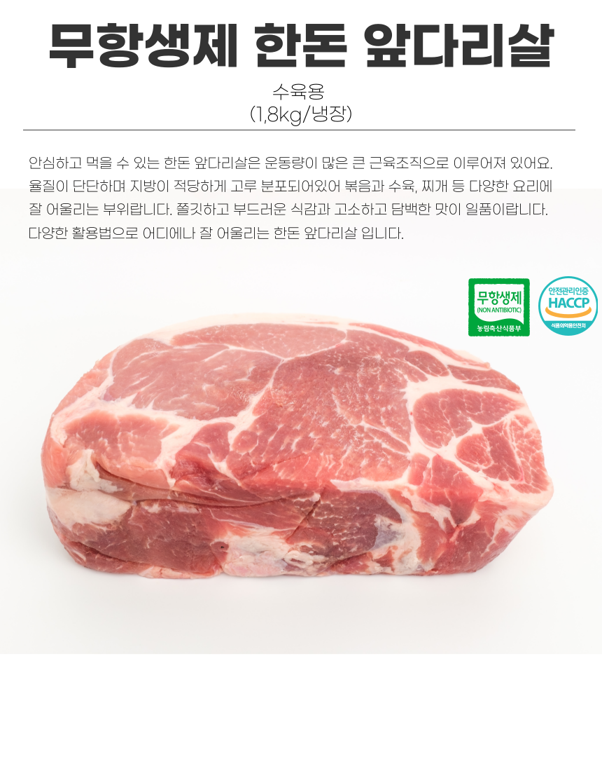 | 상품구성 | 무항생제 앞다리살 수육용 1.8kg /아이스팩/아이스박스 |