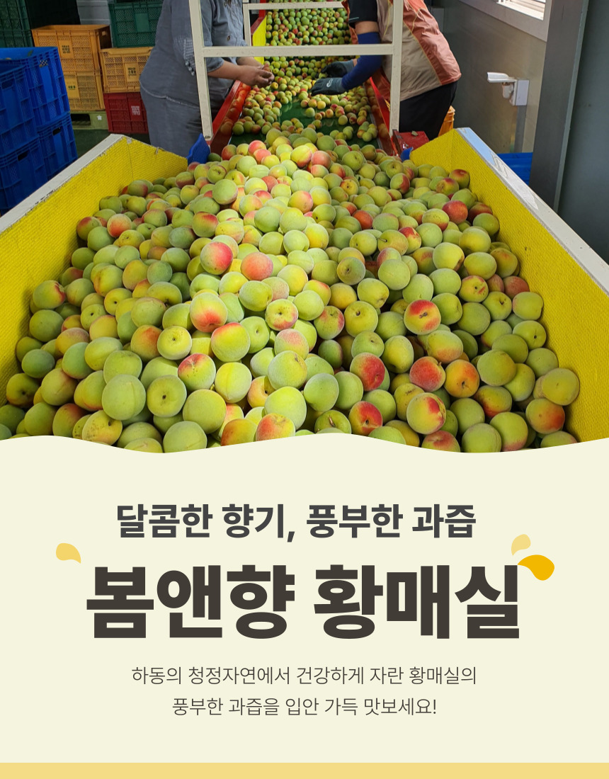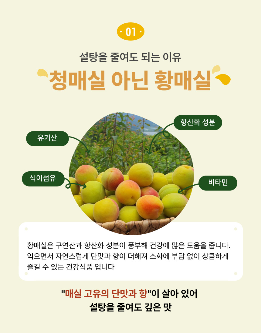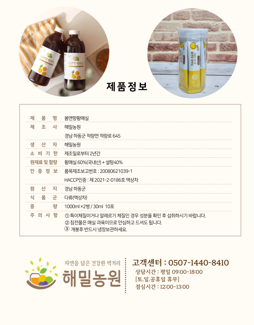 | 소비자 안전을 위한 주의사항 | 1. 본 제품은 농축된 황매실 원액으로, 권장 희석 비율 (물 또는 탄산수 1:4~1:5) 또는 기호에 따라 희석하여 음용하십시오. 2. 직사광선을 피해 서늘하고 건조한 곳에 보관하십시오. 3. 침전물이 생길 수 있으나, 이는 황매실의 천연 성분이므로 안심하고 흔들어 드십시오. 4. 당알코올, 인공감미료, 보존료를 첨가하지 않았으며, 원물의 당류가 농축되어 당뇨 등 건강에 민감하신 분은 섭취 전 전문가와 상담하십시오. 5. 어린이, 임산부, 특이 체질 |