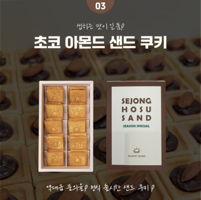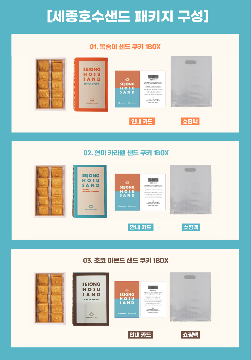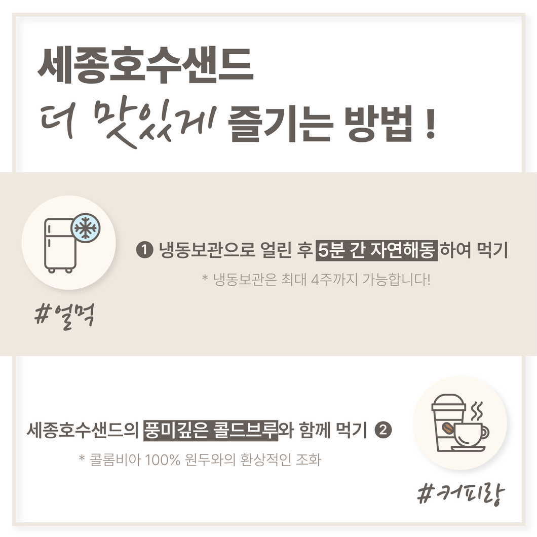 세종호수샌드는 매주 월,화,수,목오후 2시 전 주문건에 한 해순차적으로 당일출고됩니다.이 점 참고하여 주문 해주시길 바랍니다. 아래 두가지 맛은 옵션 선택사항으로 현미카라멜(6구), 아몬드 초코(6구) 중 1가지 맛을 선택해 주시길 바랍니다 ^^ 패키지 구성은 박스, 안내카드, 쇼핑백과 함께 아래 사진의 예쁜 보자기로 포장해서 보내드립니다 ^^