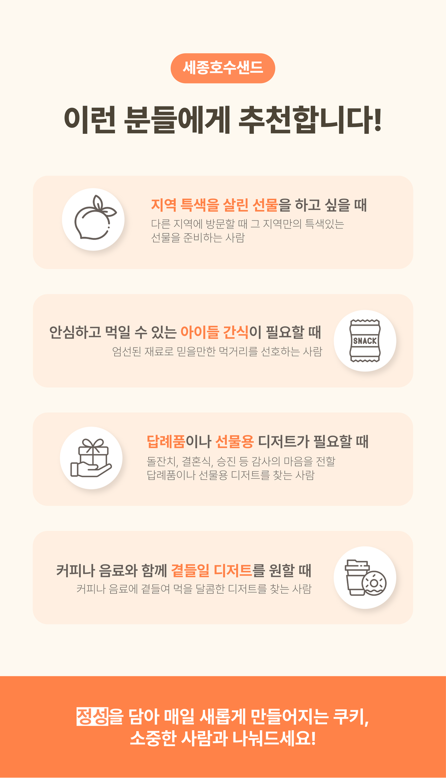 세종호수샌드는 매주 월,화,수,목오후 2시 전 주문건에 한 해순차적으로 당일출고됩니다.이 점 참고하여 주문 해주시길 바랍니다. 세종호수샌드의 시그니쳐 복숭아 샌드 선택 옵션으로 아래 두가지 맛 중 선택 부탁 드립니다 ^^ 여기에 추가로 세종호수샌드에서 주문 제작한 이쁜 다회용 보냉백으로 포장해 드립니다 ^^