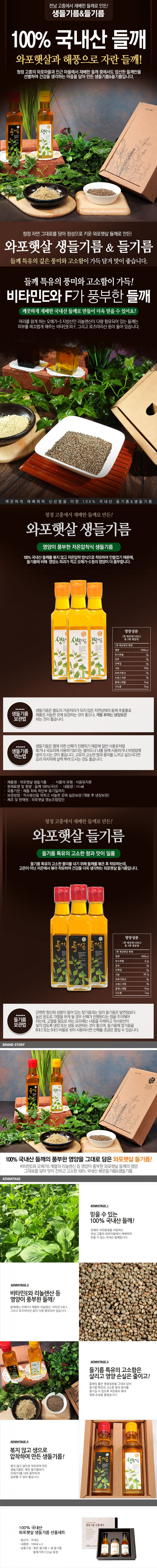 | 포장단위별 내용물의 용량(중량), 수량 | 180ml생들기름+180ml볶은들기름+120g들깨가루 |