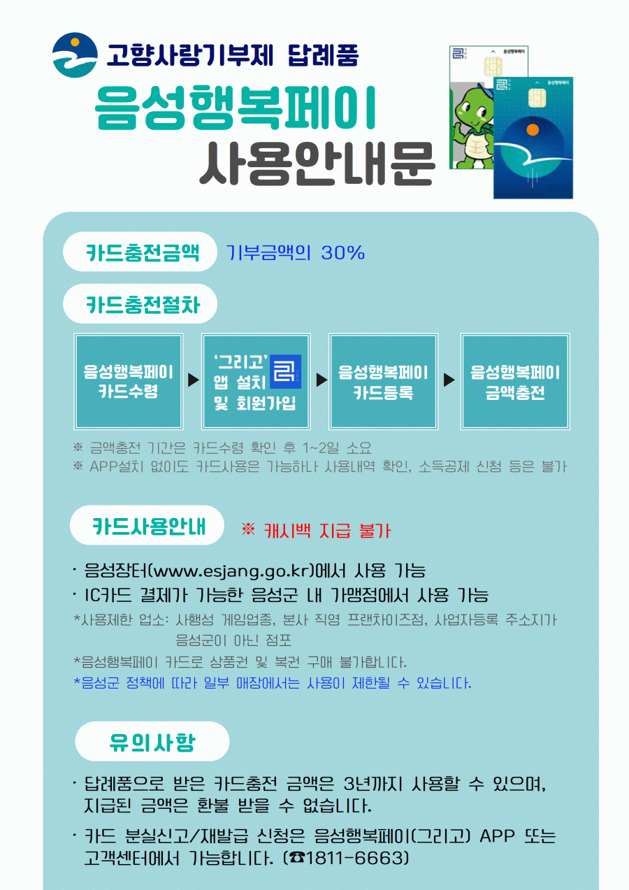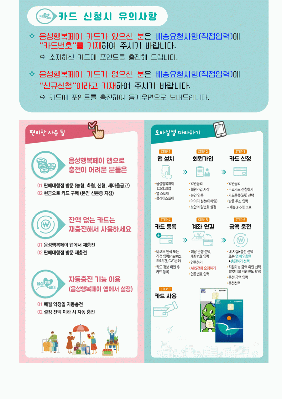 ★ 음성행복페이 카드가 있으신 분은 배송요청사항(직접입력)에 "카드번호"를 기재하여 주시기 바랍니다.