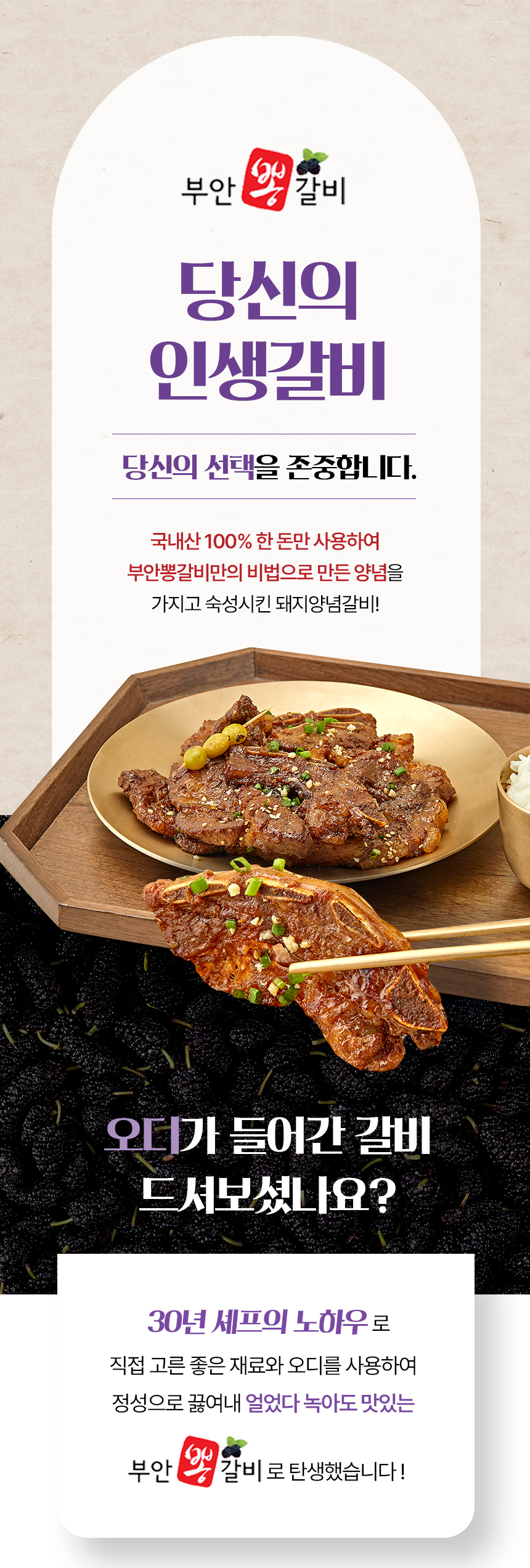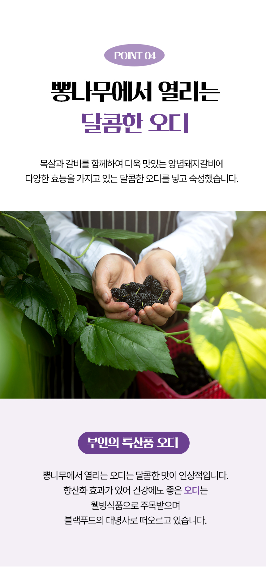 | 원재료명 및 함량 | 돼지갈비31%(국내산), 돼지목살22%(국내산), 대파(국내산),마늘(국내산),오디(국내산),정제수,혼합간장,물엿,갈색설탕,양파,사과,무,생강,후추가루,식용유,참기름,소주,볶음참깨 |