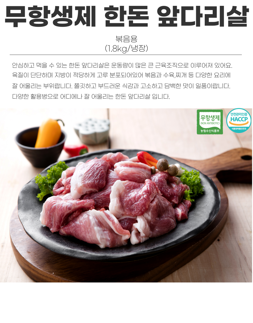| 상품구성 | 무항생제 앞다리살 볶음용 1.8kg /아이스팩/아이스박스 |