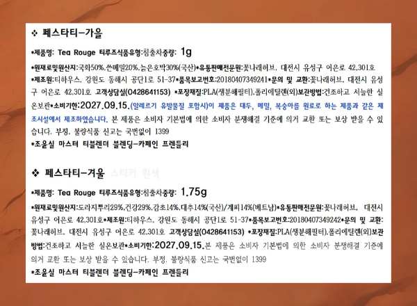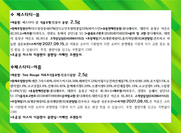 페스타 티 봄 25g(2.5g*10개입) + 여름 25g(2.5g*10개입) + 가을 10g(1g*10개입) + 겨울 17.5g(1.75g*10개입)