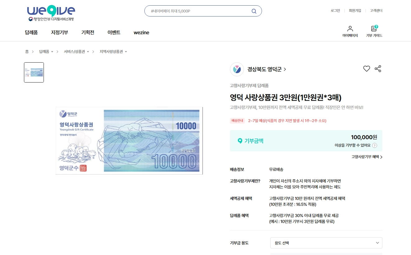여기에, 기부한 금액의 30% 내에서 지역 특산품을 답례품으로 고를 수 있는데, '영덕사랑상품권' 또한 선택 가능한 인기 답례품 중 하나입니다.