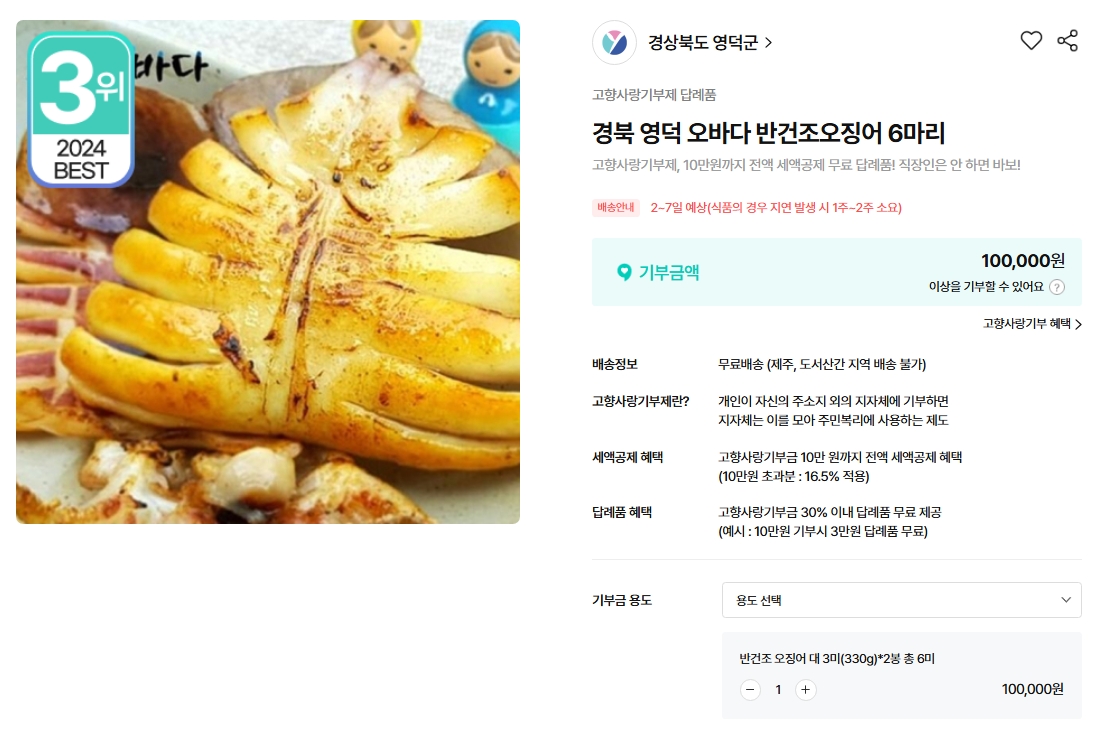 실제로 지금 '위기브'에서 영덕군을 선택하면, 답례품으로 '경북 영덕 오바다 반건조오징어 6마리' 를 직접 고를 수 있죠.
