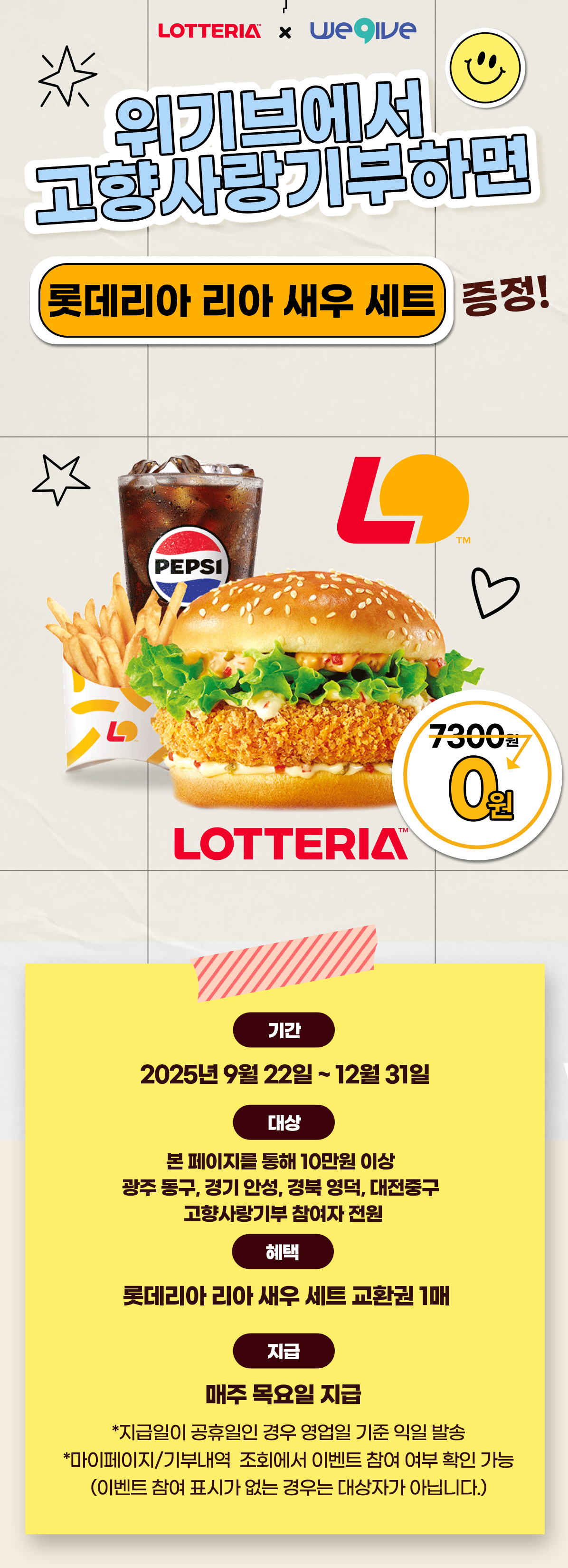 이벤트 기간(9/22~12/31) 동안, '위기브'에서 광주 동구, 경기 안성, 경북 영덕, 대전 중구 4곳 중 한 곳에 10만원 이상 고향사랑기부제에 참여한 모든 분들께, 기존 고향사랑기부제 혜택에 더해 '롯데리아 리아 새우 세트 교환권' 을 추가로 증정합니다.