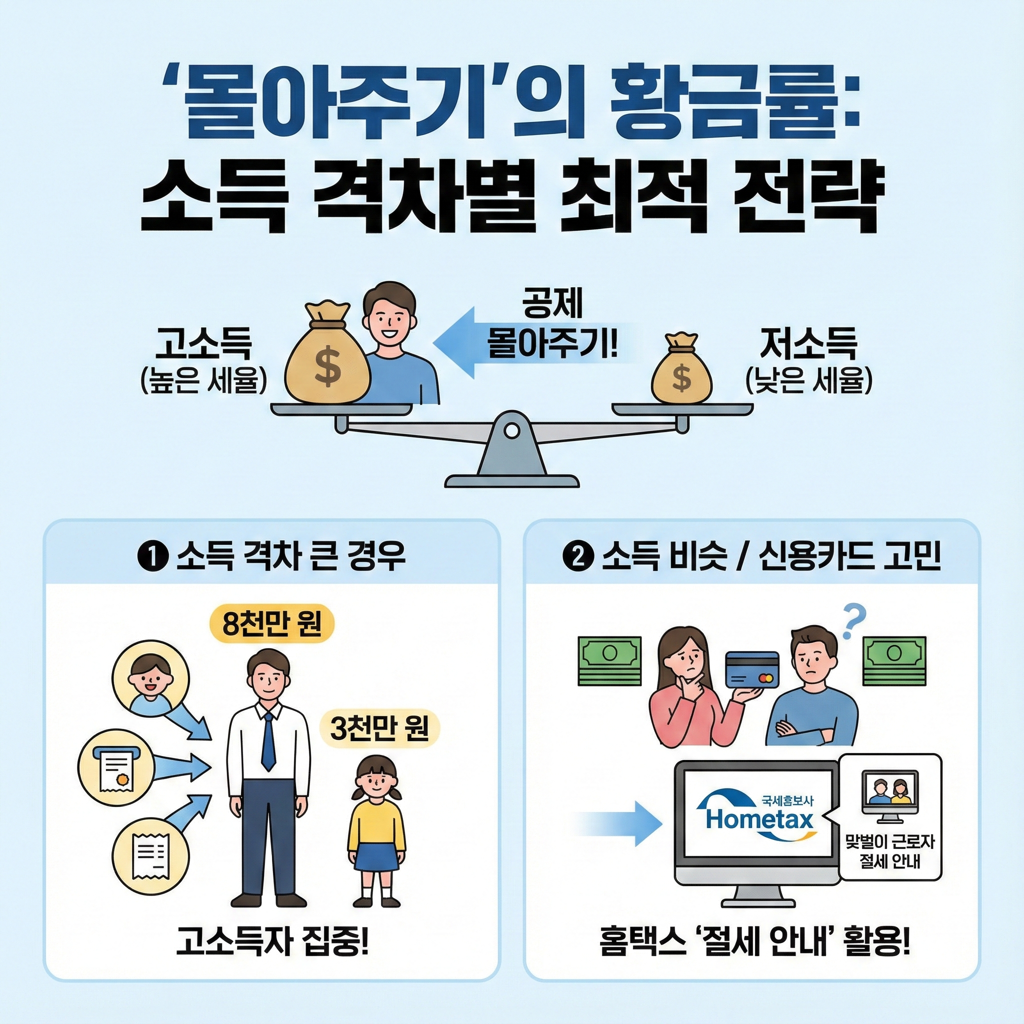 2️⃣ 기본 원칙은 '고소득자 몰아주기'입니다. 세율이 높은 쪽의 소득을 줄여야 절세 효과가 큽니다.