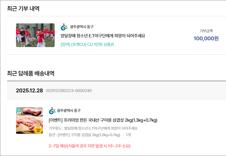 내가 기부한 광주 동구는 포켓 CU 앱 > 위기브로 접속해 기부하면 CU 모바일 상품권 1만원이 추가로 제공됨.