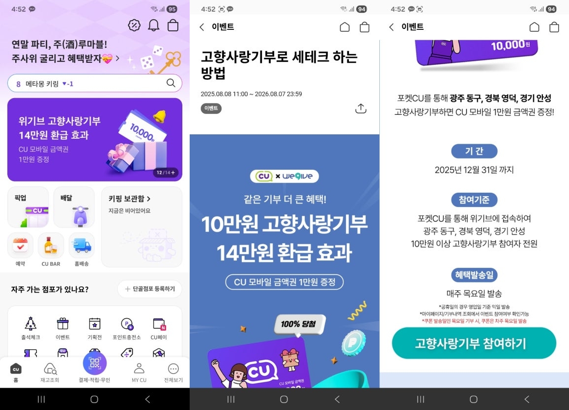 이를 활용하려면 포켓 CU 앱에서 고향사랑기부제 배너를 클릭해 위기브로 이동한 후 기부하면 됨.