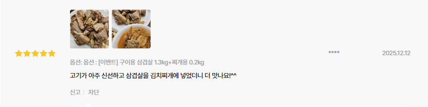 “삼겹살을 김치찌개에 넣었더니 맛나요!” 처럼 식사에 제대로 활용해주셨다고도 남겨주셨어요.