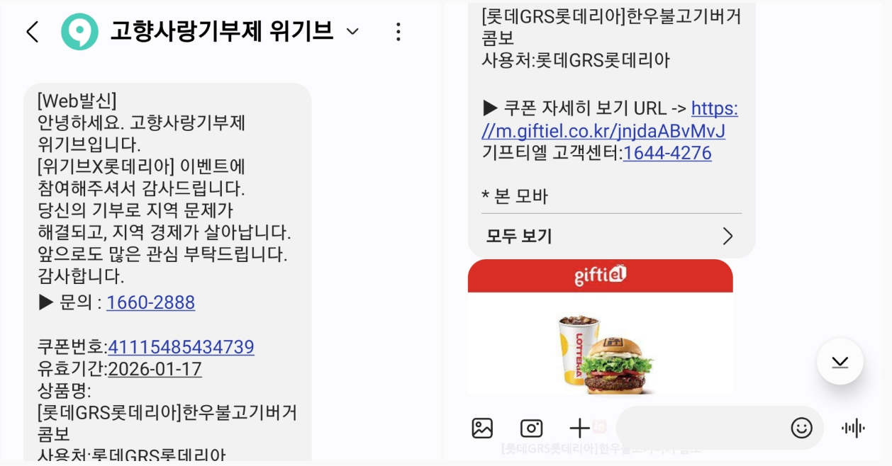 사실 이건 남편에게 추천받았는데요 답례품뿐만 아니라 위기브 롯데리아 이벤트를 통해 엘포인트와 롯데리아 한우불고기버거 콤보 기프티콘을 추가로 받을 수 있어요.