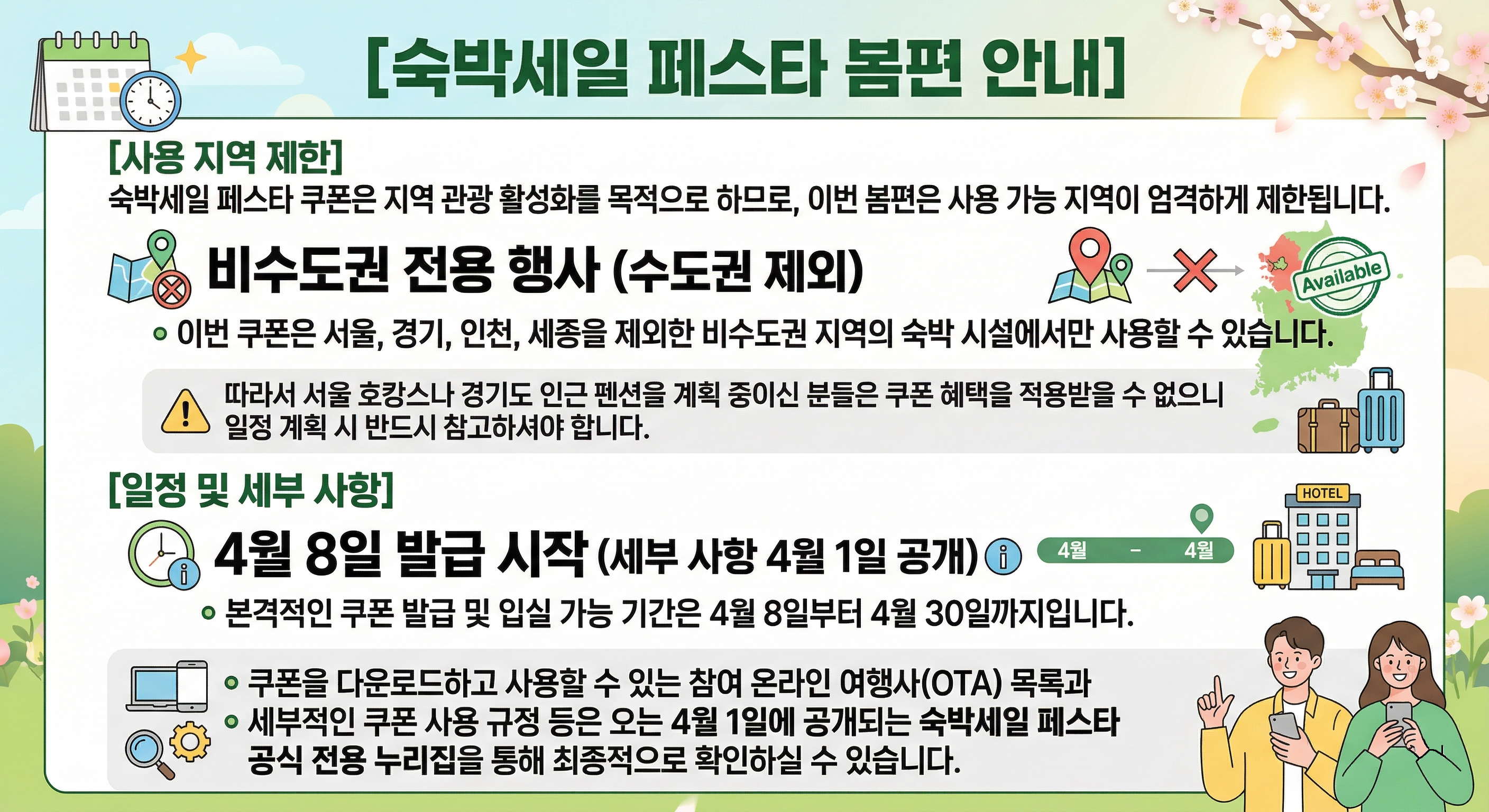 "이번 주는 벚꽃 보러 서울 호텔 가려 했는데, 수도권은 아예 쿠폰 적용이 안 되네요." 숙박 페스타는 혜택이 크지만 '비수도권 한정'이라는 강력한 조건 때문에 수도권이나 근교 나들이를 계획했던 많은 직장인들이 아쉬움을 삼키고 있습니다.